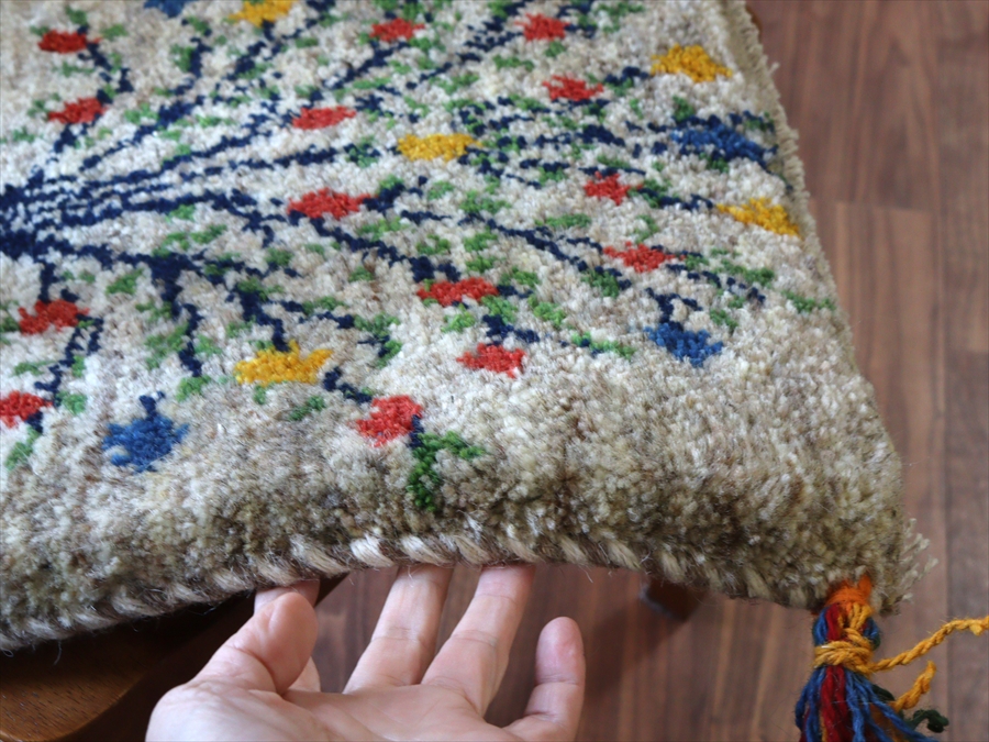ギャッベ イラン産手織り 座布団サイズ 41x40cm グレー ベージュ 花をつけた生命の木