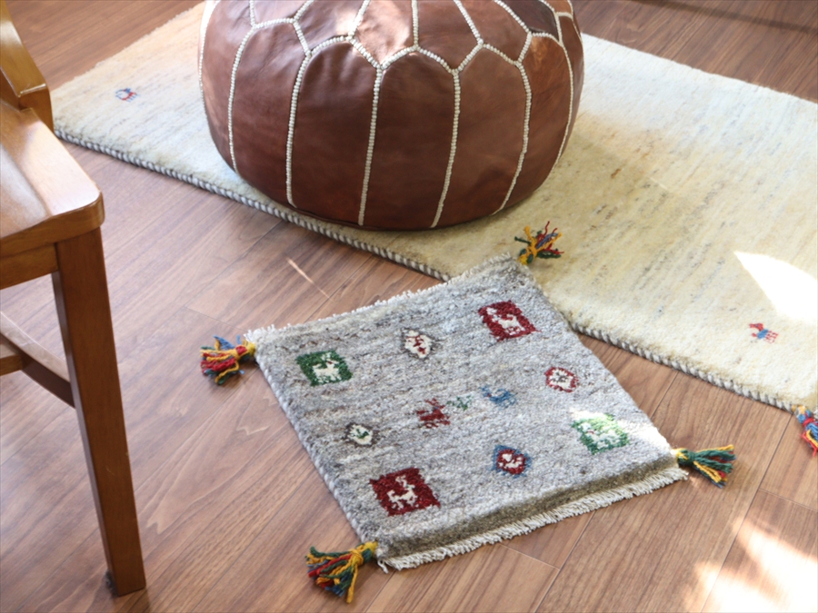 ギャッベ イラン産手織り 座布団サイズ 38x40cm 無染色の羊毛のグレー