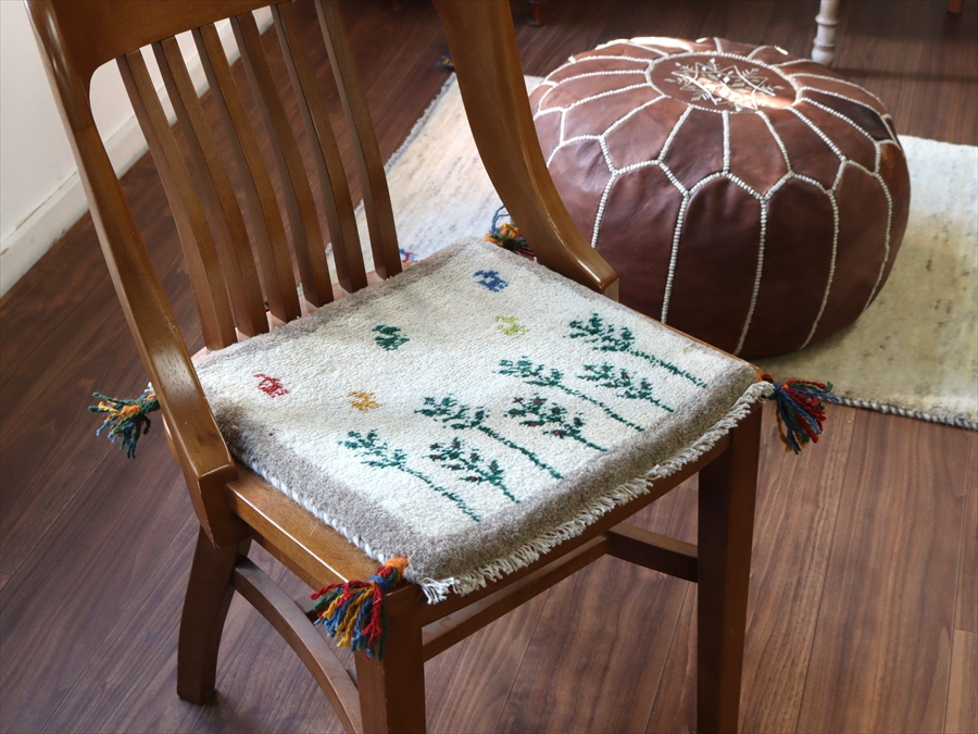 ギャッベ イラン産手織り 座布団サイズ 39x40cm ナチュラルアイボリー グリーンの草花