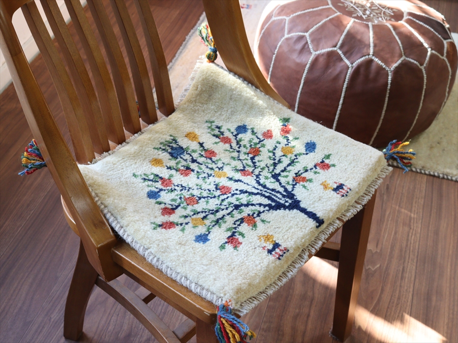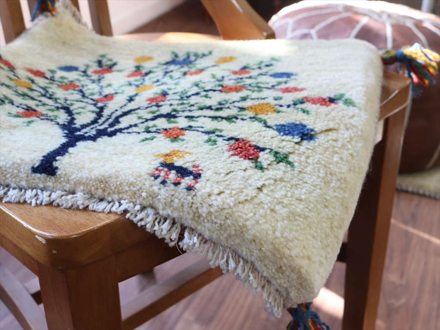 ギャッベ イラン産手織り 座布団サイズ 38x43cm ナチュラルアイボリー 花をつけた生命の木