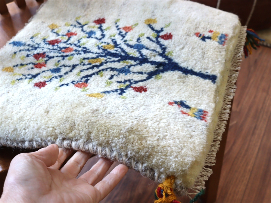 ギャッベ イラン産手織り 座布団サイズ 38x41cm ナチュラルアイボリー 花をつけた生命の木