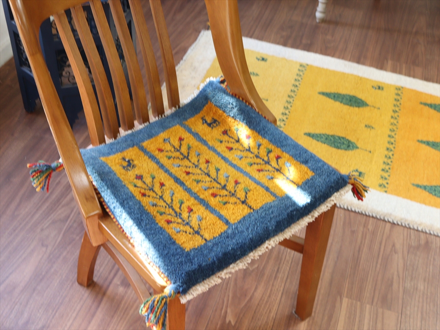 | 何枚も集めたくなる、40cm角の座布団サイズギャベ。四隅に大きなポンポンのついた、伝統的なスタイルでおられています。フローリングに並べて座布団がわりに使ったり、ベンチやダイニングチェアの座面など、使い方はいろいろ。壁にタペストリーのように飾るのもおすすめです。 |