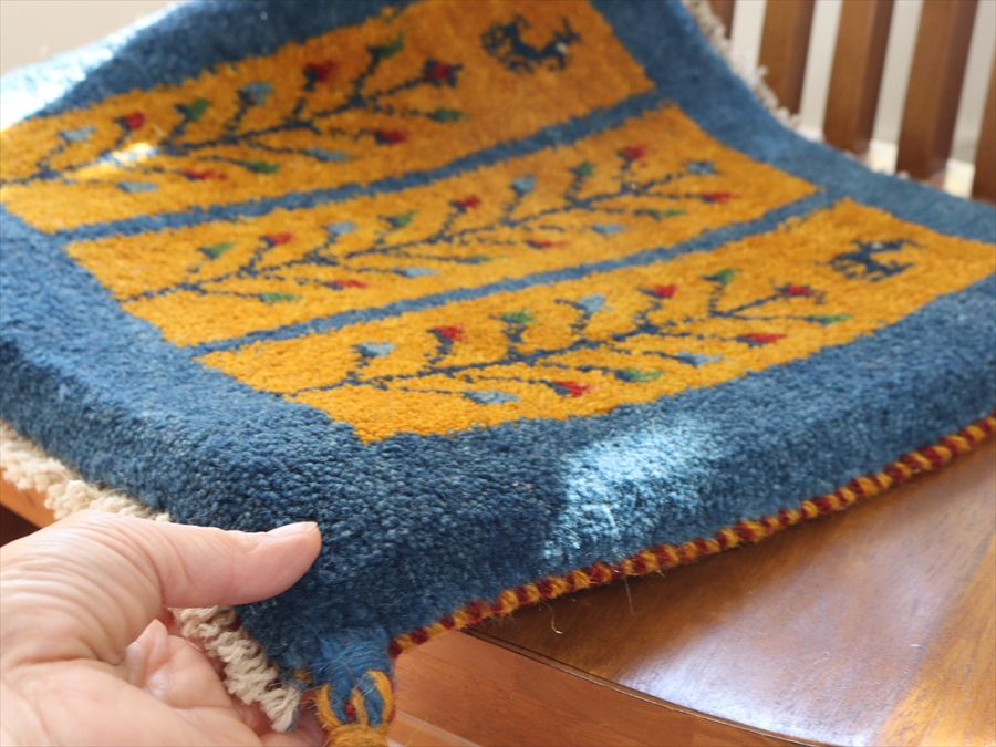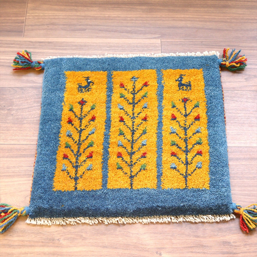 ギャッベ イラン産手織り 座布団サイズ 40x42cm オレンジ ブルー 生命の木