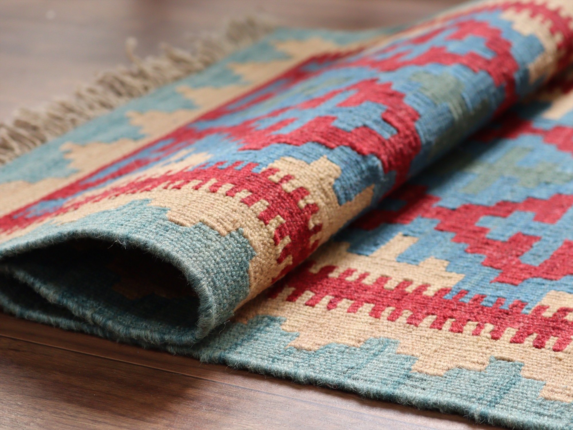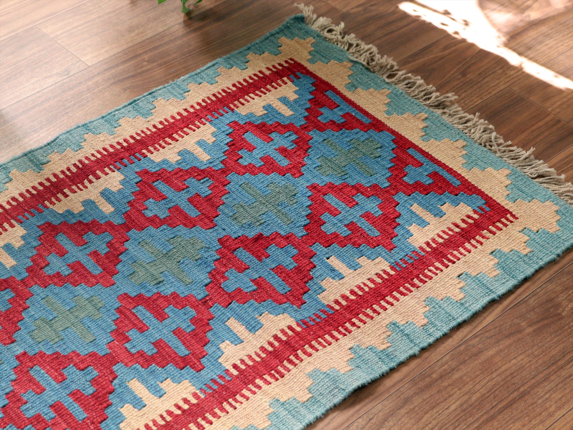 - 手織りキリム イラン シラーズ93×62cm カラフルな幾何学モチーフ