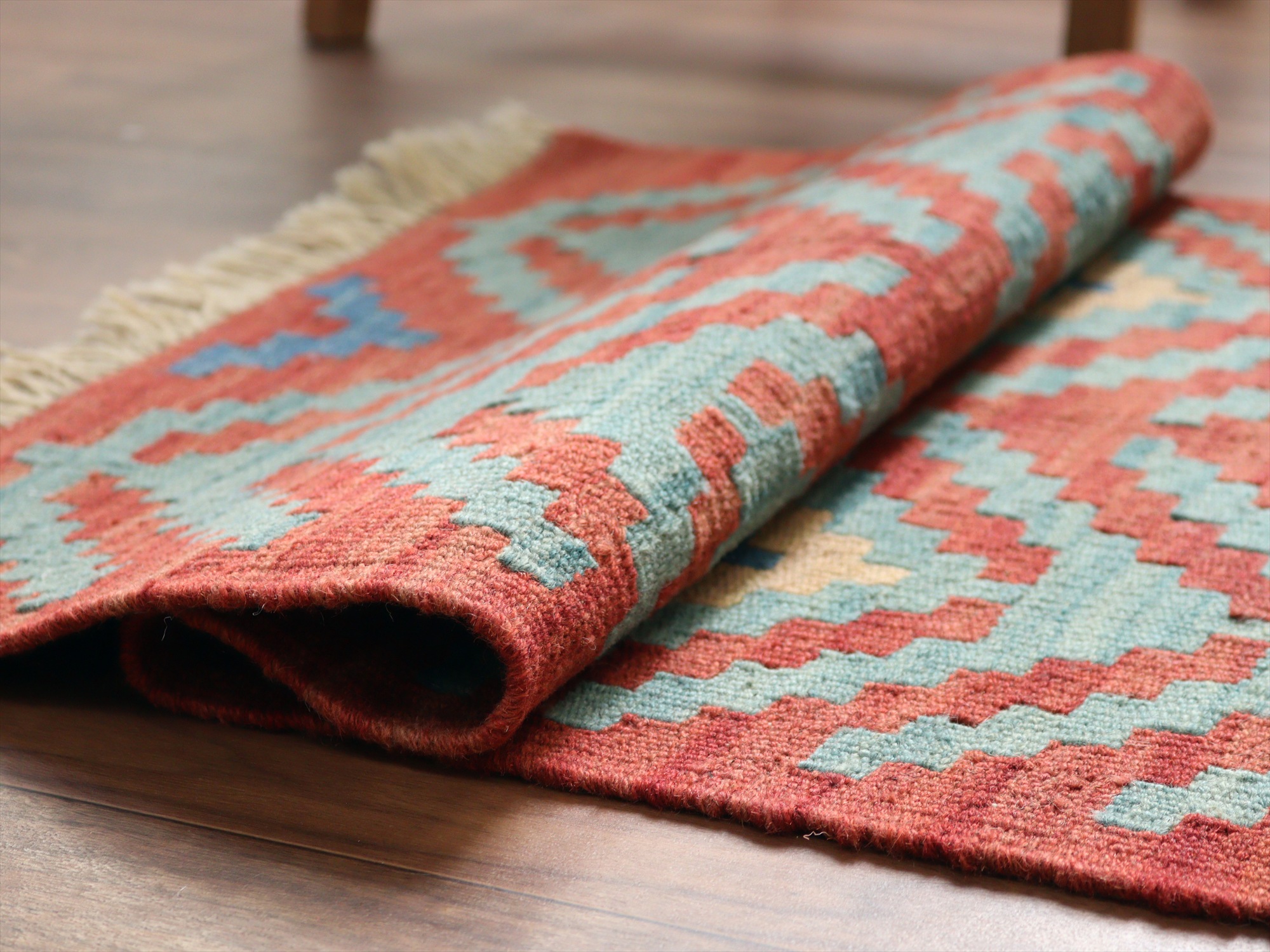 | 6-7mm程度の厚みがあり、パイル(毛足)がない平織りの敷物で表面は少しザラっとした肌ざわりです。織り手の自由なアイデアでデザインされていますので、左右対象でなかったり、モチーフが少しずれていたりということもありますが、世界で一枚だけの作品ですからその点はご了承ください。 |