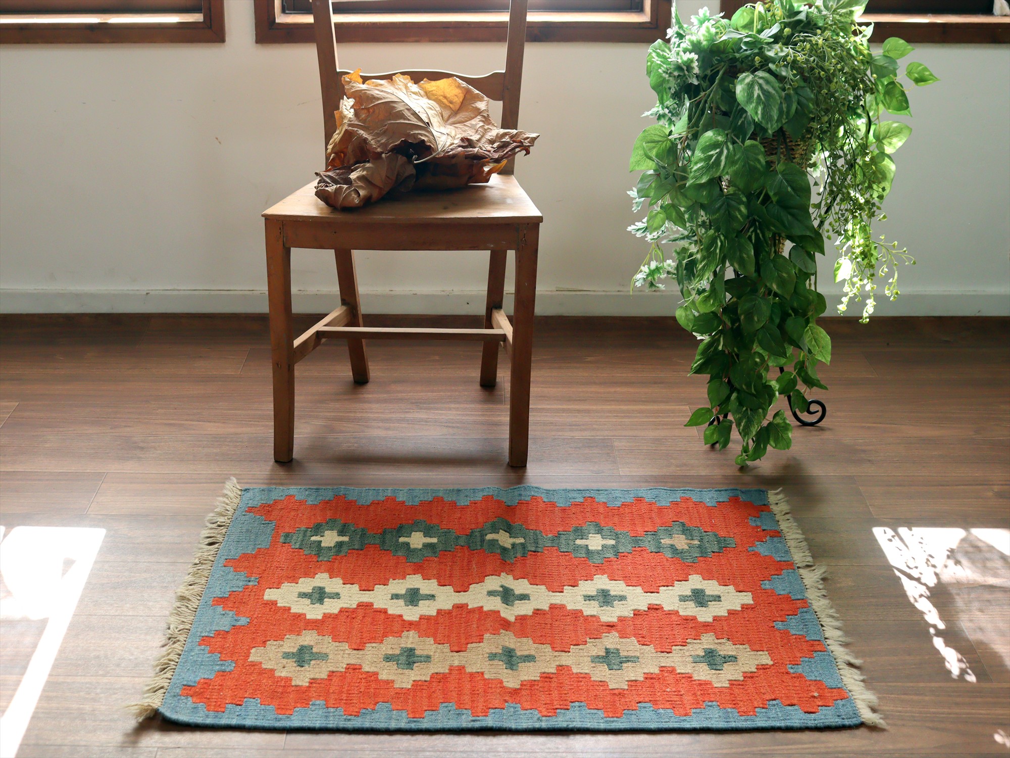 - 手織りキリム イラン シラーズ87×65cm カラフルな幾何学モチーフ