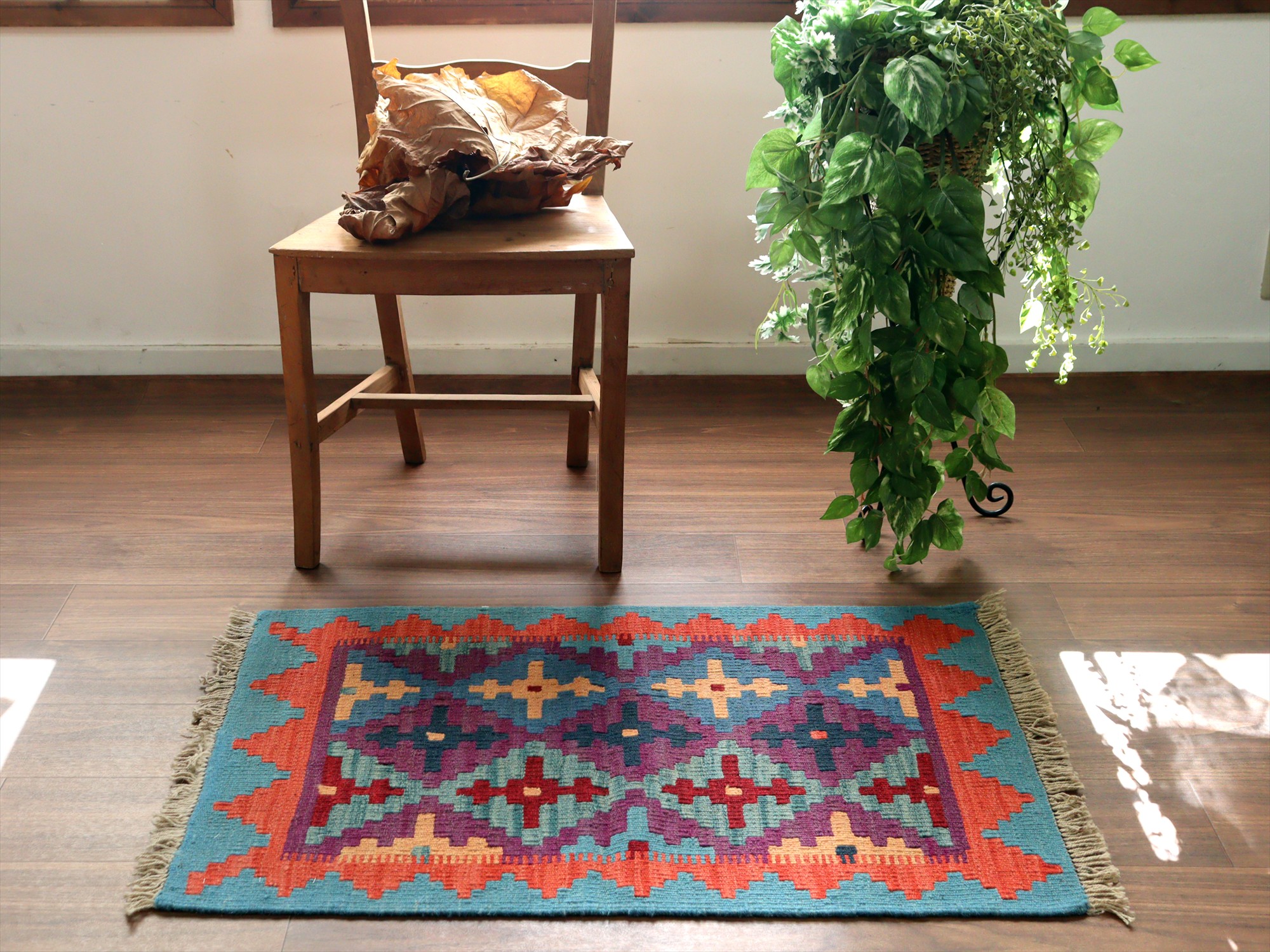手織りキリム イラン シラーズ88×62cm カラフルな幾何学モチーフ