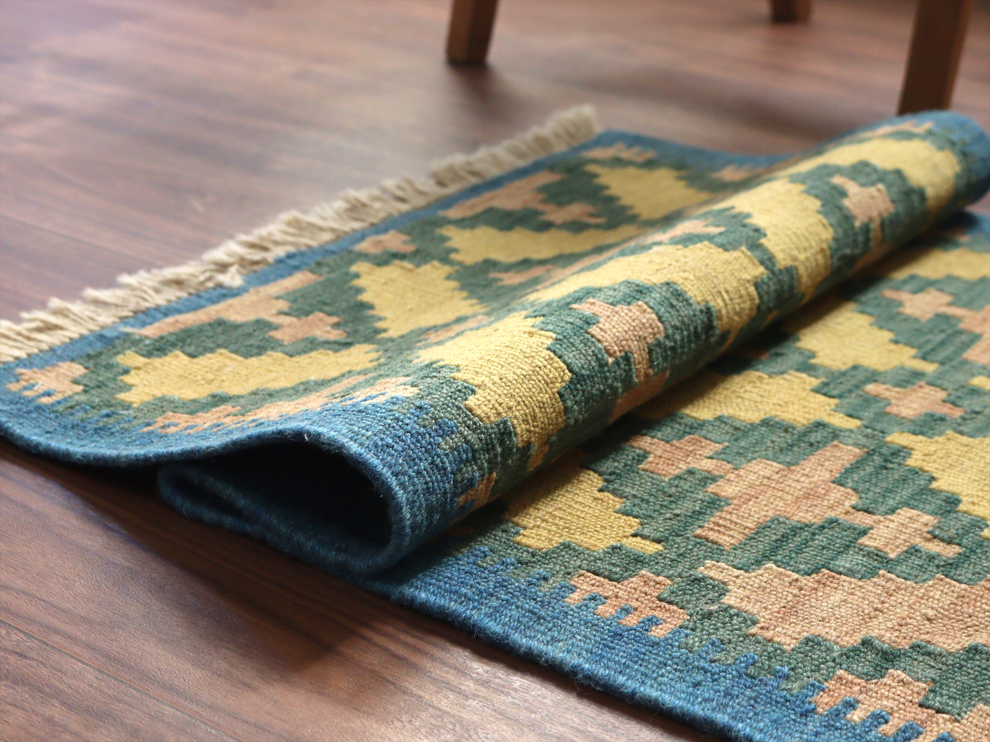 | 6-7mm程度の厚みがあり、パイル(毛足)がない平織りの敷物で表面は少しザラっとした肌ざわりです。織り手の自由なアイデアでデザインされていますので、左右対象でなかったり、モチーフが少しずれていたりということもありますが、世界で一枚だけの作品ですからその点はご了承ください。 |