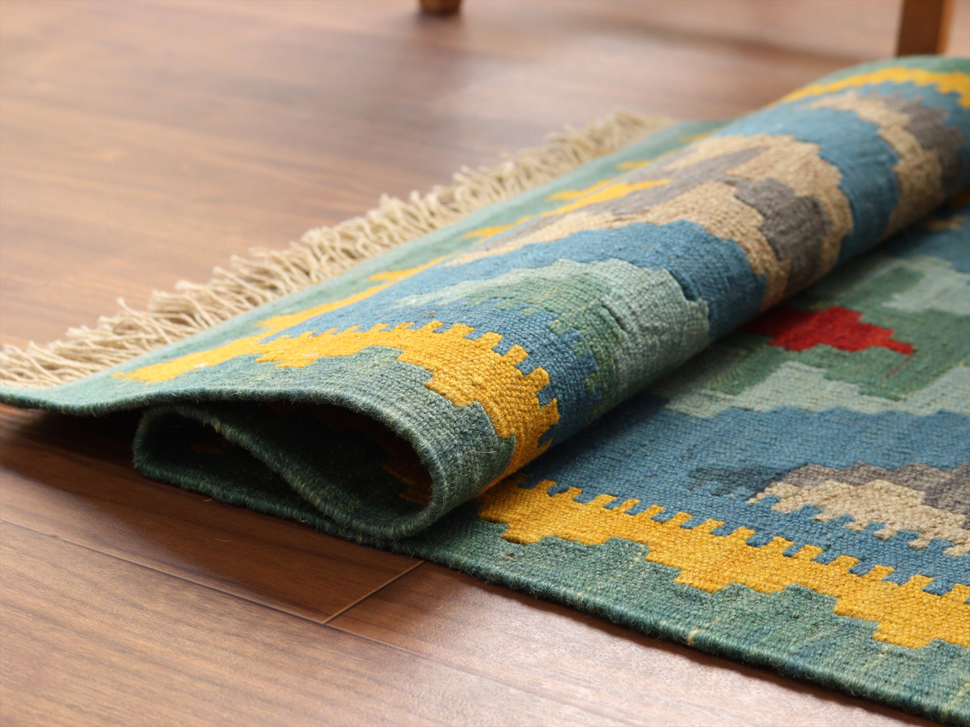 | 6-7mm程度の厚みがあり、パイル(毛足)がない平織りの敷物で表面は少しザラっとした肌ざわりです。織り手の自由なアイデアでデザインされていますので、左右対象でなかったり、モチーフが少しずれていたりということもありますが、世界で一枚だけの作品ですからその点はご了承ください。 |