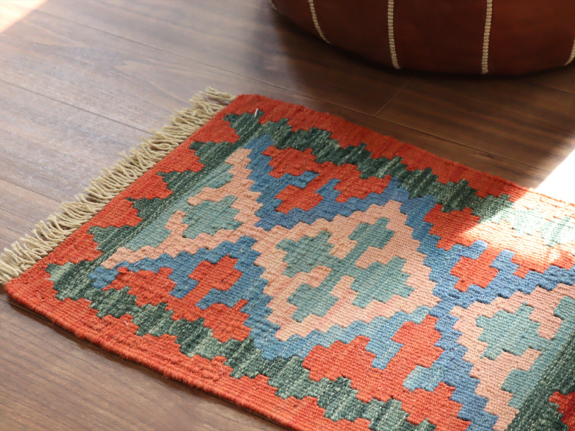 | しっかりとしたハリのある織りで、厚みは4mm前後。多少カタチがゆがみがありますが、手織りキリムならではの味わいとご理解ください。 |