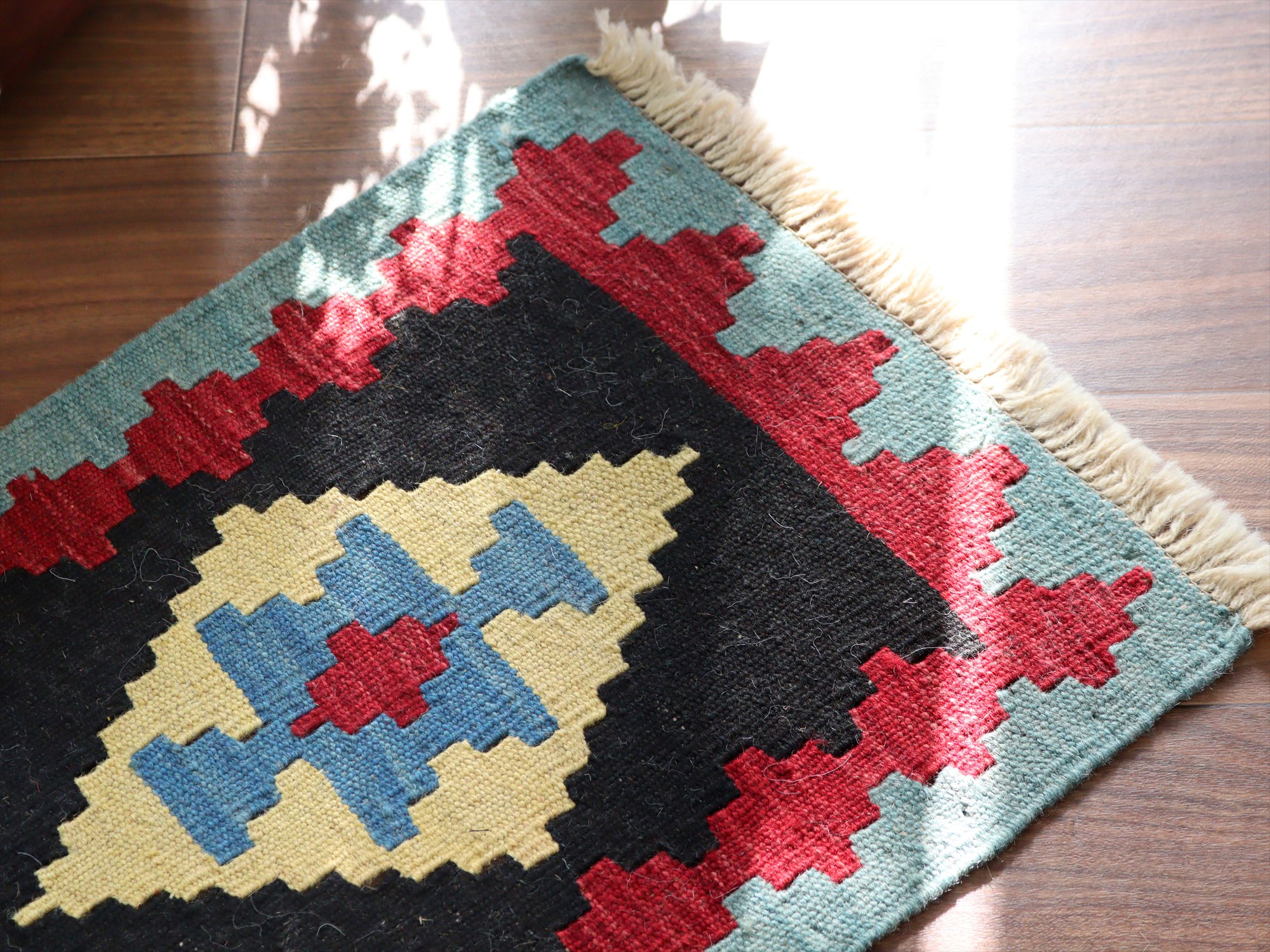 | しっかりとしたハリのある織りで、厚みは4mm前後。多少カタチがゆがみがありますが、手織りキリムならではの味わいとご理解ください。 |