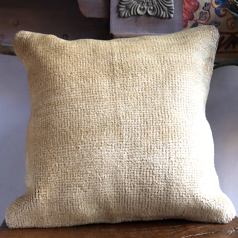 長い間家庭で使われていたり、ダメージがあったりする手織りカーペットを使っているため、表面のパイルはすり減って結び目が見えている部分やなどがあります。クッションに加工する前には、きれいに水洗いされています。