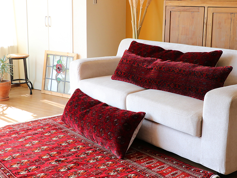 | アフガニスタン北部で織られている、とても細かな織りの手織りじゅうたんからのカット。パイルはビロードのよう光沢があってなめらかな肌触りです。とても目のつまった織り地で、濃い深みのある色合いが魅力的です。 ベッドヘッドに、枕と並べて置くのに調度よいサイズのクッションとしてつくられました。細長なので2人掛けのソファに腰あてとして置いてもよさそうです。 |