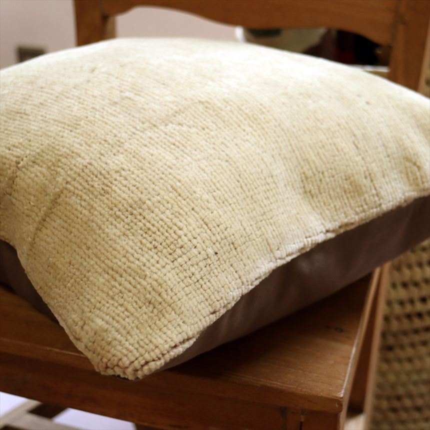 オールドカーペットをブリーチして作られたクッションカバー。モノトーン系の渋い色合いと、素朴で落ち着いた雰囲気が魅力的。オリジナルラグのデザインはかなりうっすらでほとんど残っていません。