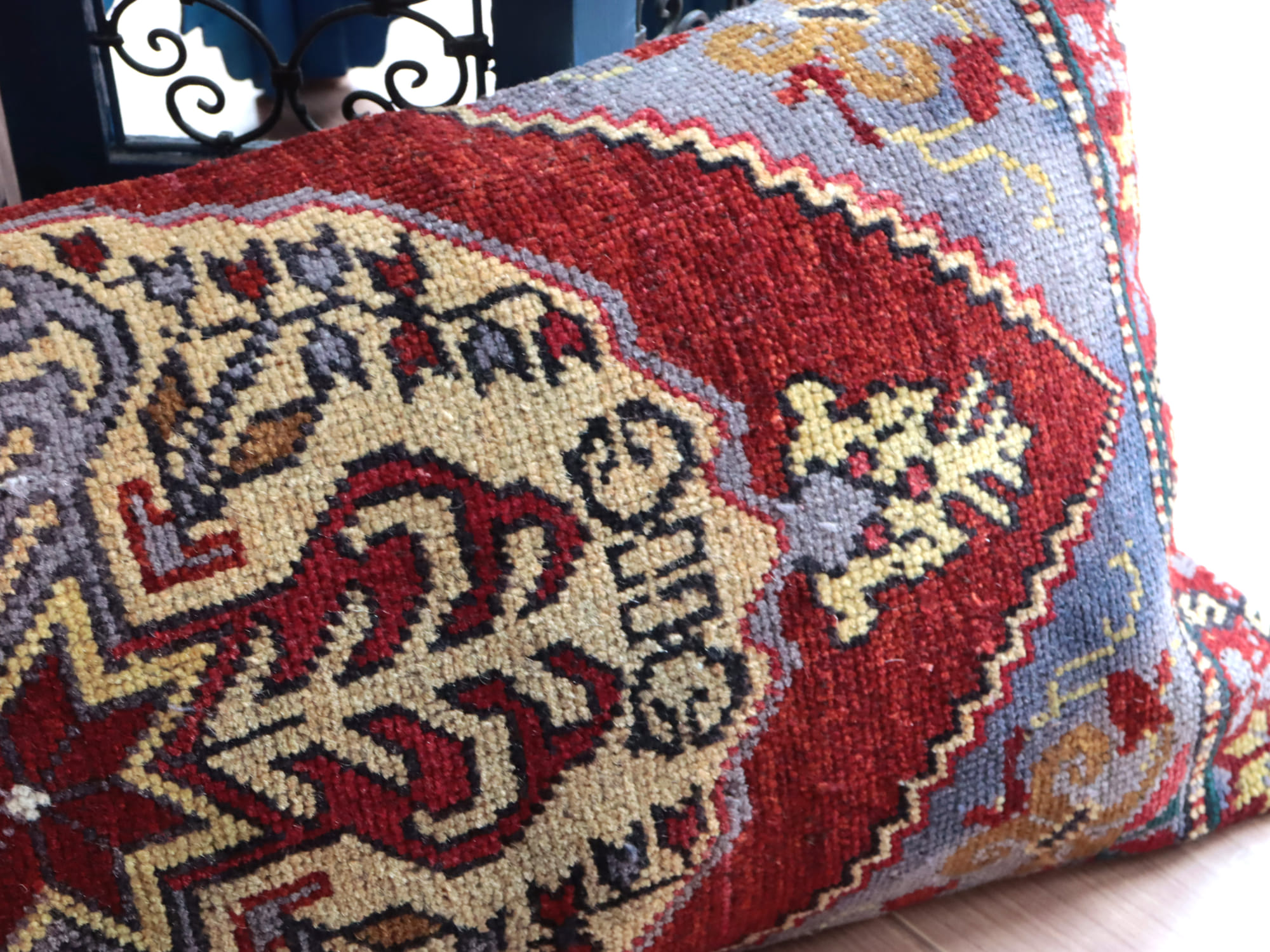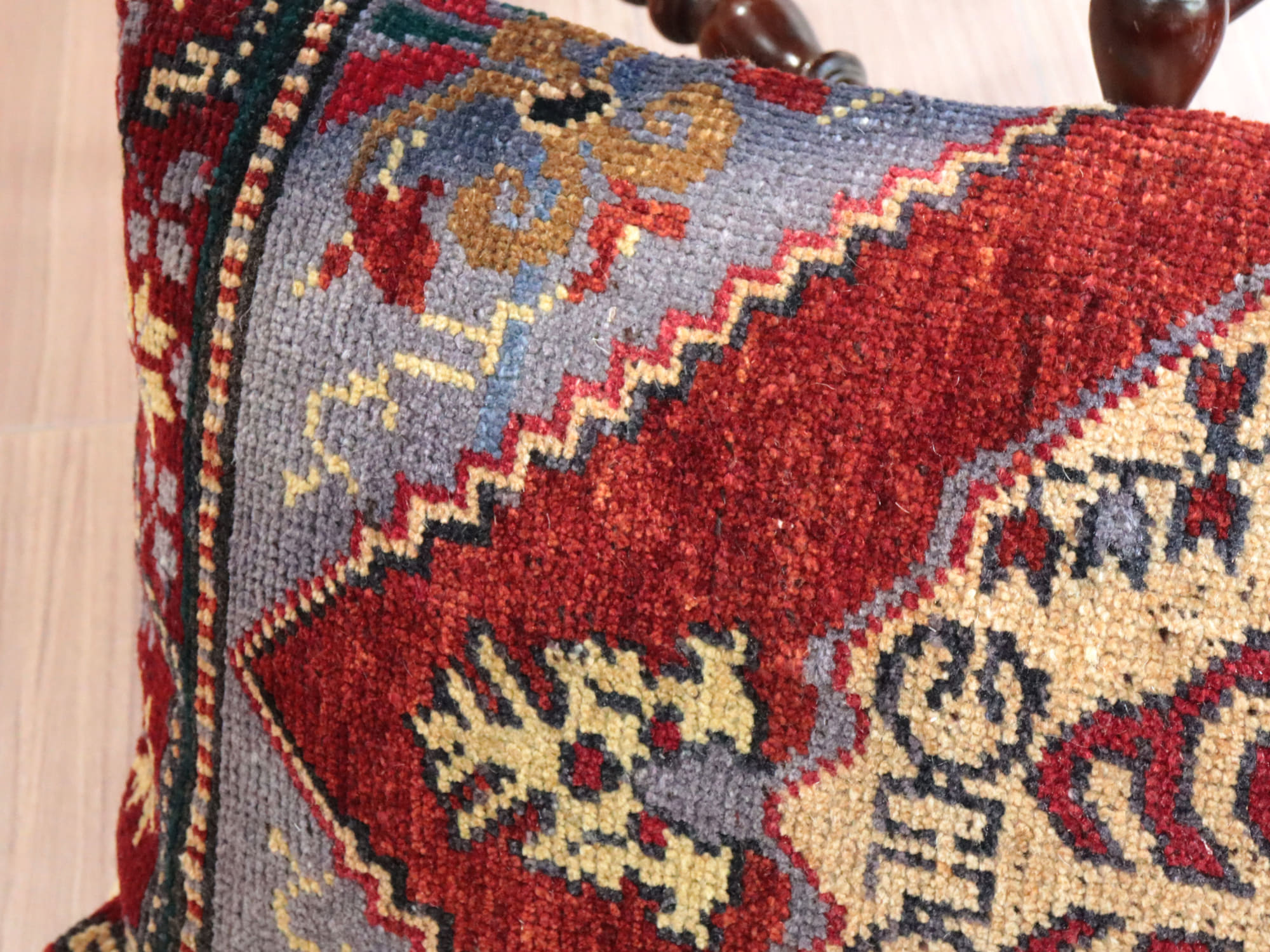 | アナトリア中央、コンヤ・タシュプナル地方で織られたヤストゥク(クッション用に織られた絨毯)です。オリジナルのサイズをいかしてそのままクッションに仕立ててあるため、中央に六角形のメダリオンがあるバランスよいデザインです。毛布やお布団をつめてクッションとしてお使いいただけます。 |