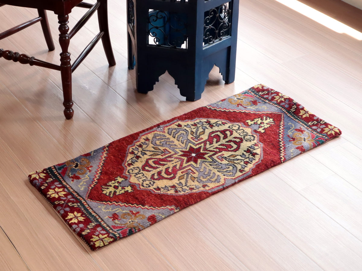| 毛足が短く表面は柔らかめの手触りです。パイル(毛足)がすり減って、下地が見えている部分がありますが、古いじゅうたんならではの味わいを感じられます。 |