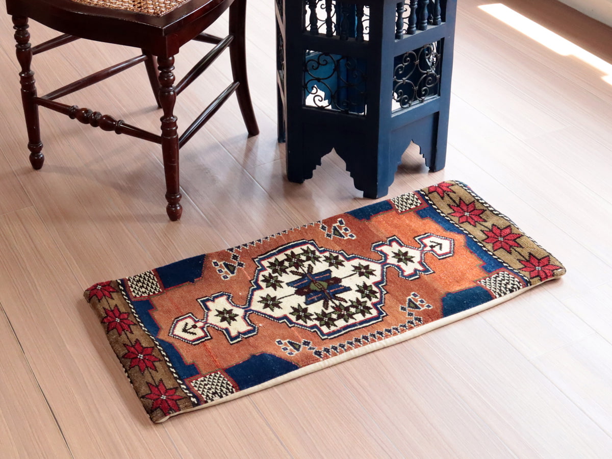 | アナトリア中央、コンヤ・タシュプナル地方で織られたヤストゥク(クッション用に織られた絨毯)です。オリジナルのサイズをいかしてそのままクッションに仕立ててあるため、中央に六角形のメダリオンがあるバランスよいデザインです。毛布やお布団をつめてクッションとしてお使いいただけます。 |