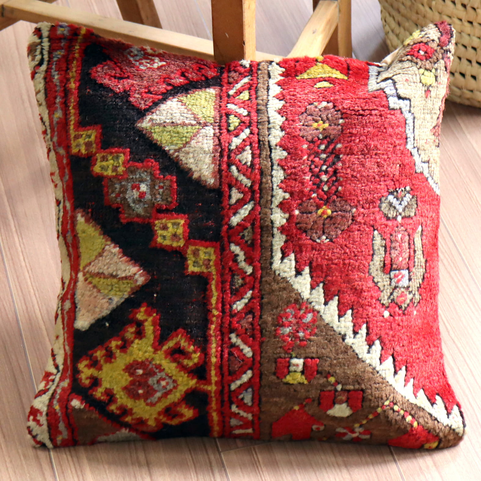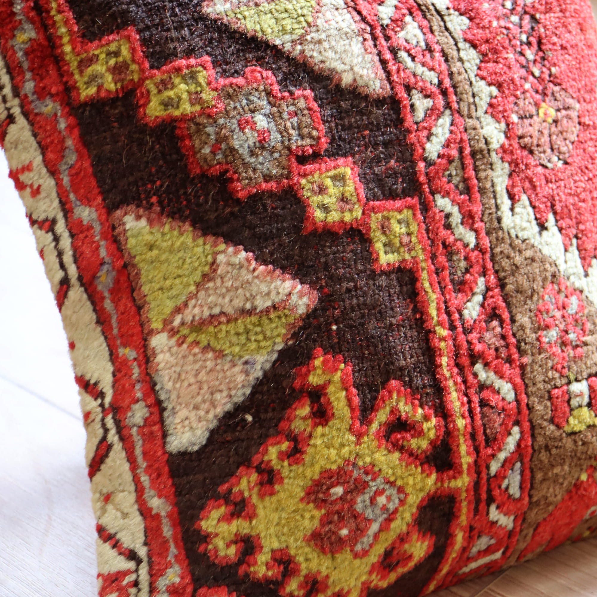 | アナトリア中央部シワス地方で織られた手織りラグを使ったクッションカバーです。織られてから50年前後経過していますが、ほとんど使われていなかった様子で、織られた当時の鮮やかな色を残しています。パイル(毛足)は長めに残っていて、表面はなめらかな肌ざわりです。 |