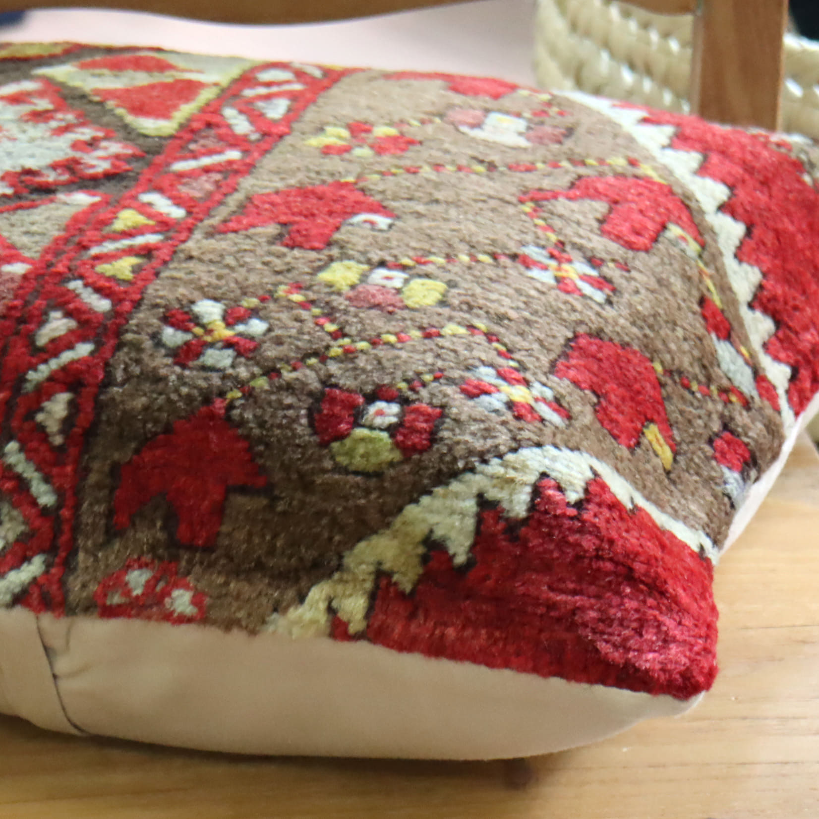 | アナトリア中央部シワス地方で織られた手織りラグを使ったクッションカバーです。織られてから50年前後経過していますが、ほとんど使われていなかった様子で、織られた当時の鮮やかな色を残しています。パイル(毛足)は長めに残っていて、表面はなめらかな肌ざわりです。 |