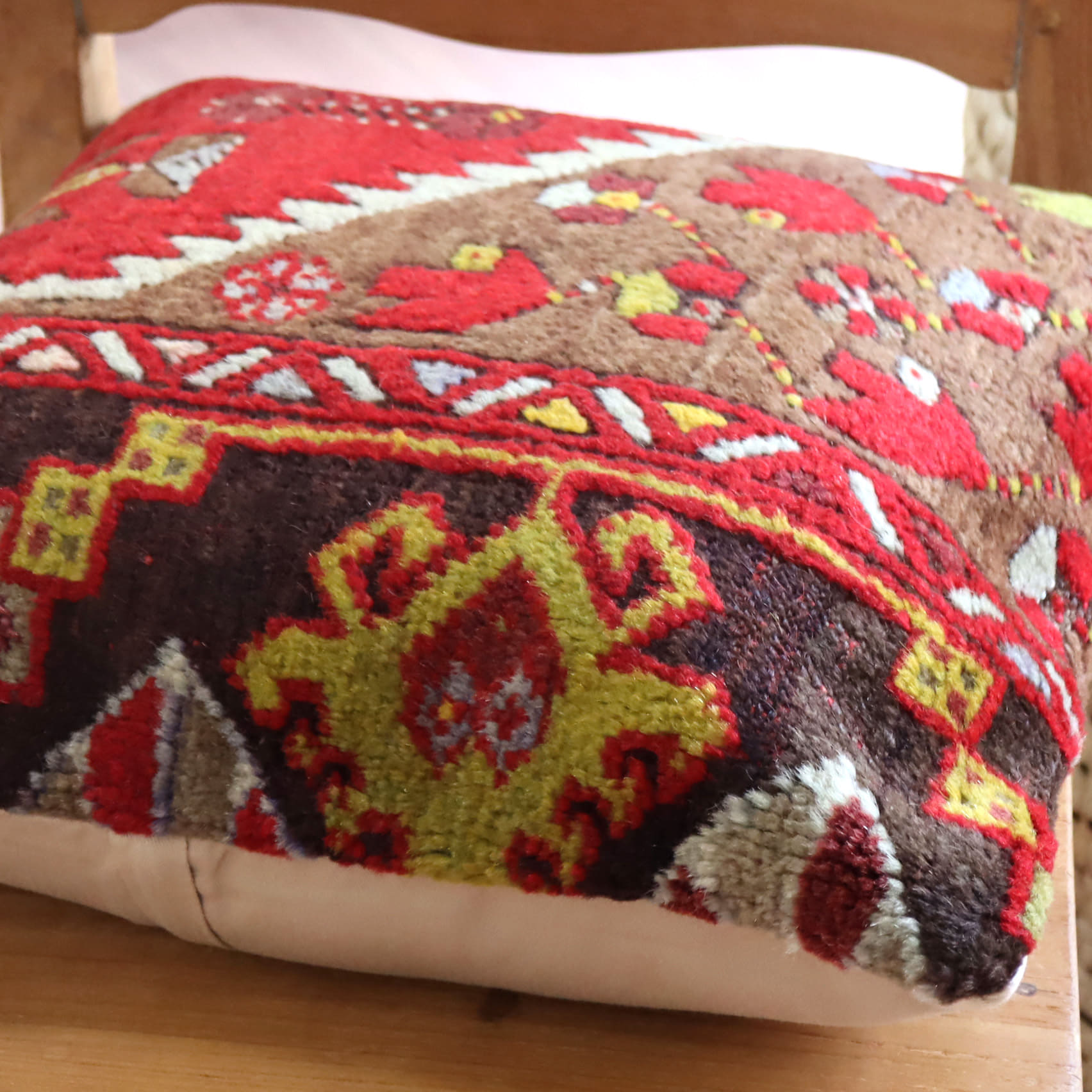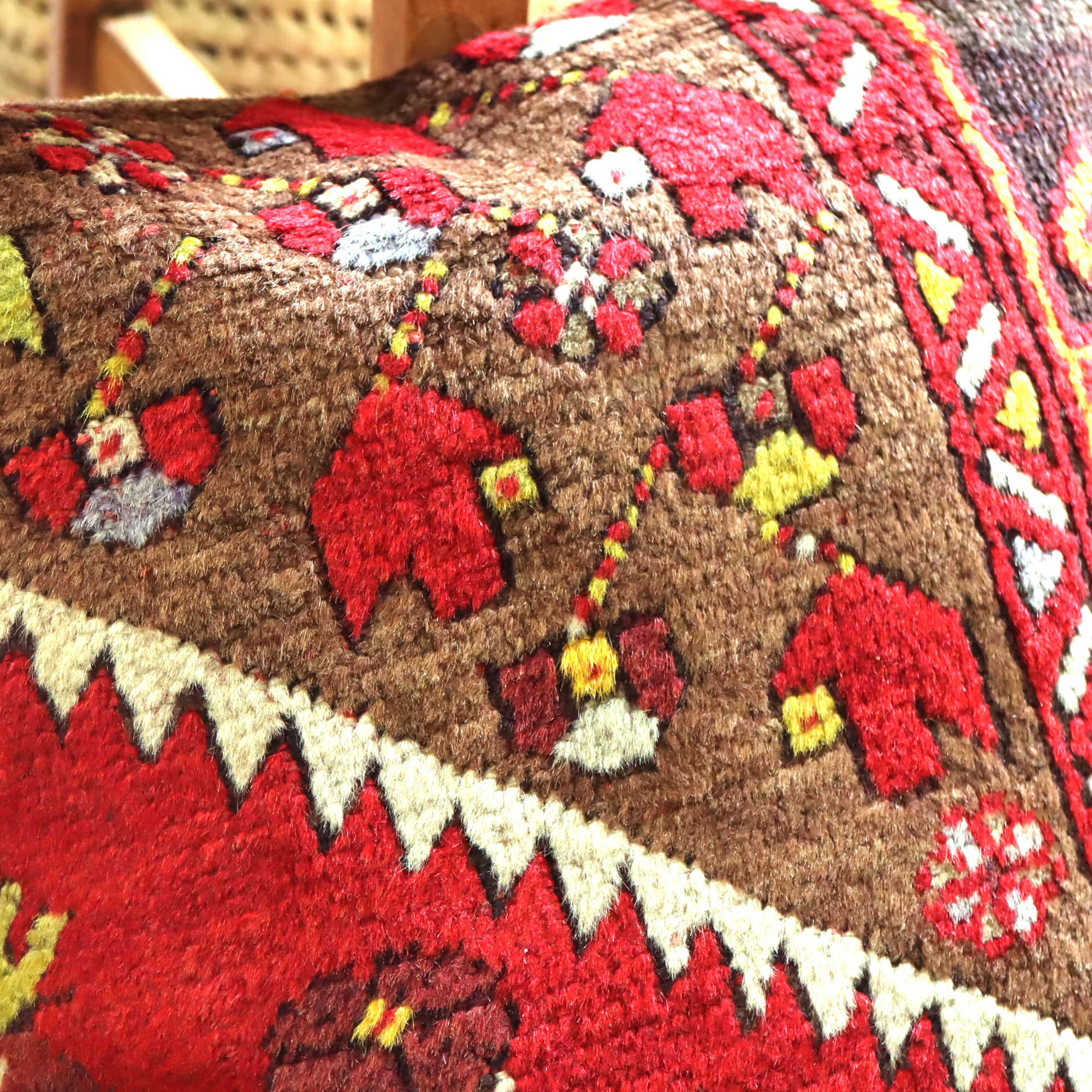 | アナトリア中央部シワス地方で織られた手織りラグを使ったクッションカバーです。織られてから50年前後経過していますが、ほとんど使われていなかった様子で、織られた当時の鮮やかな色を残しています。パイル(毛足)は長めに残っていて、表面はなめらかな肌ざわりです。 |