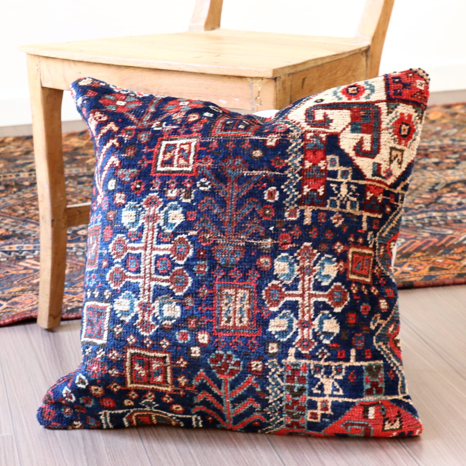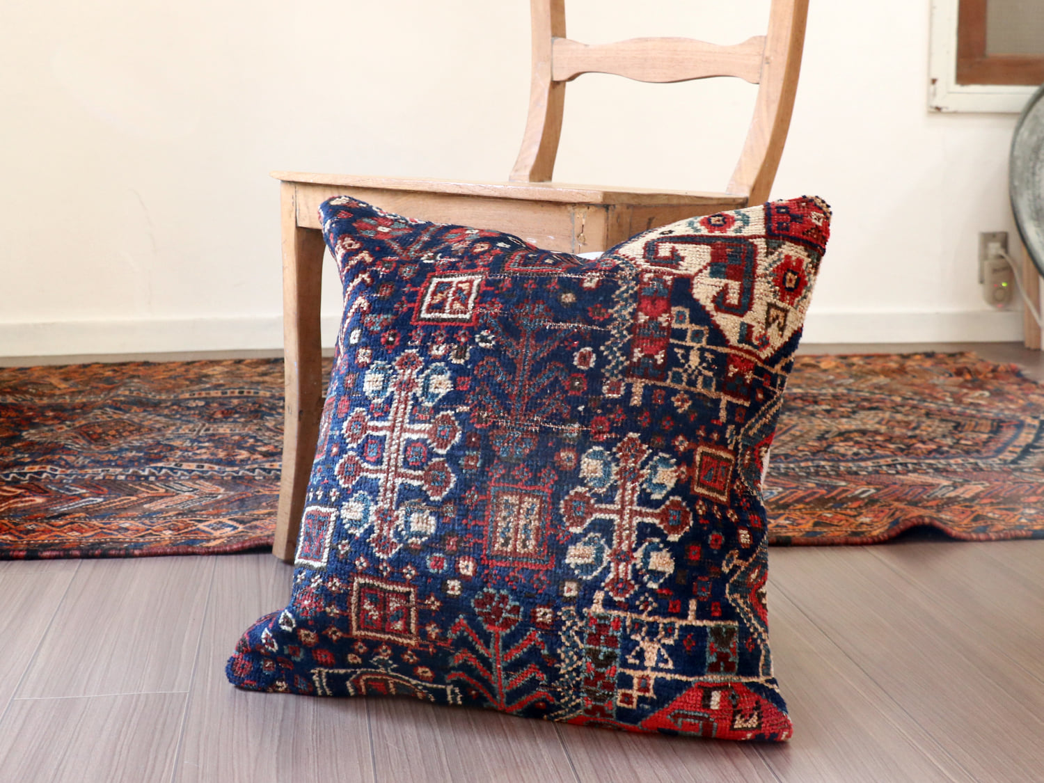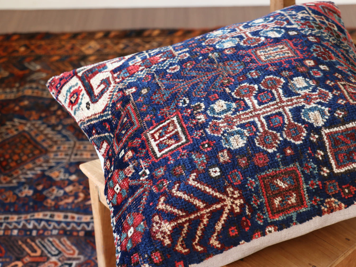 | 20世紀初頭に織られたアンティークラグからカットされたパイル織り絨毯のクッションカバーです。イラン南部に暮らすカシュカイ族のもので、天然染料による美しい色が100年経った現在でも、きれいに残っています。 |