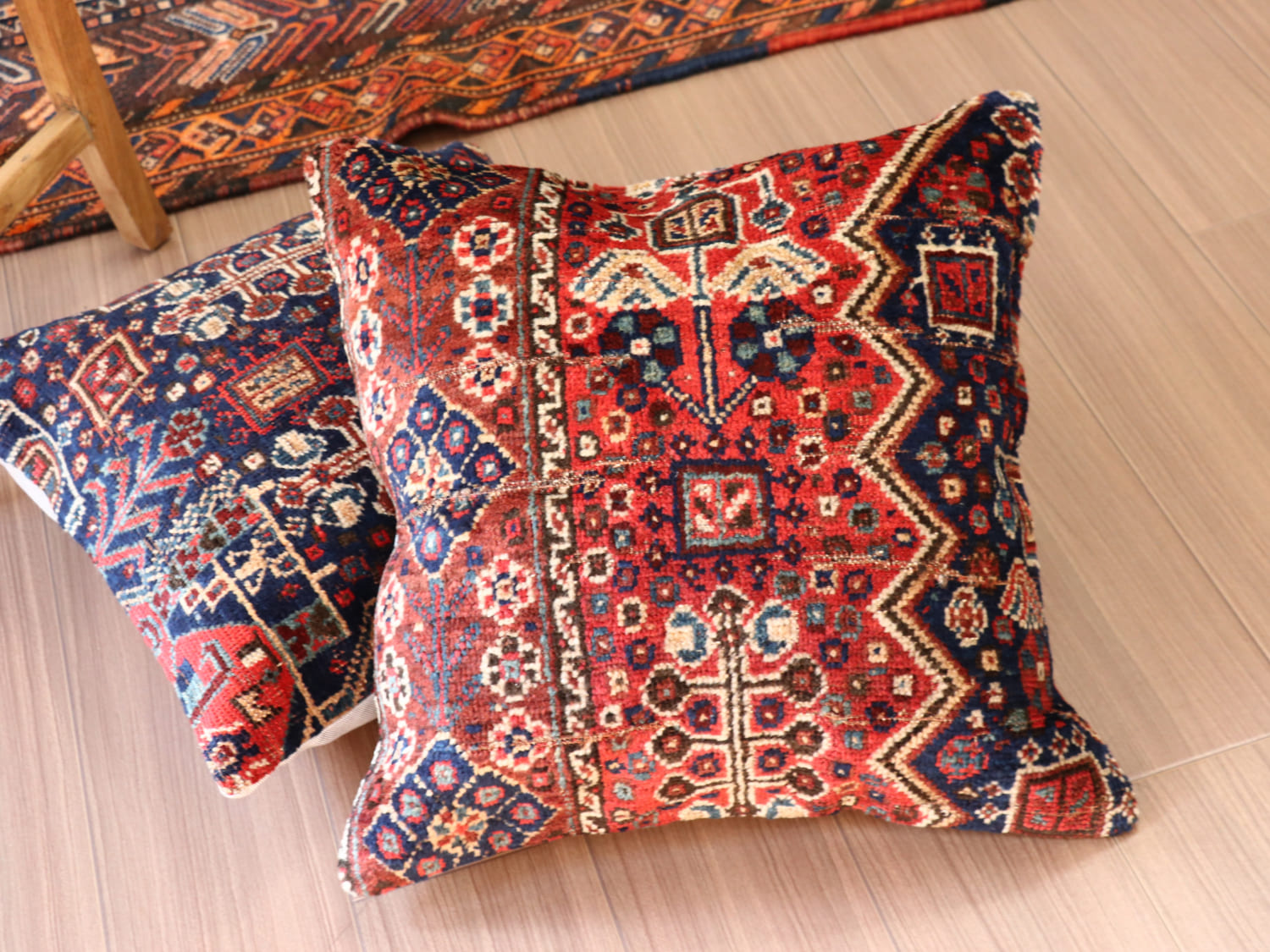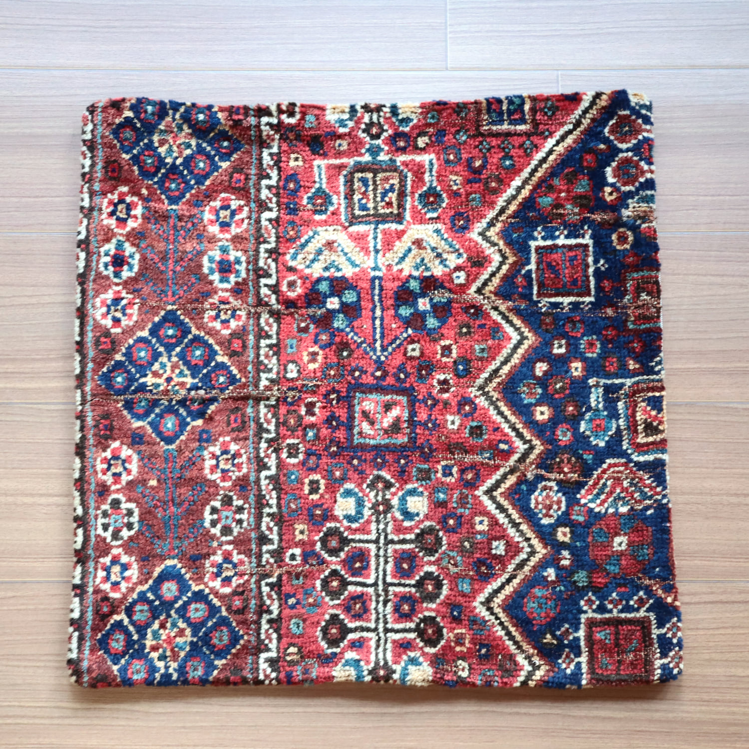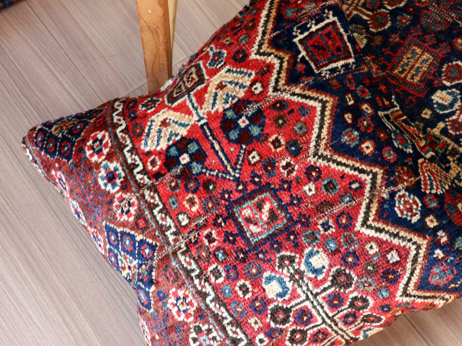 | 20世紀初頭に織られたアンティークラグからカットされたパイル織り絨毯のクッションカバーです。イラン南部に暮らすカシュカイ族のもので、天然染料による美しい色が100年経った現在でも、きれいに残っています。 |
