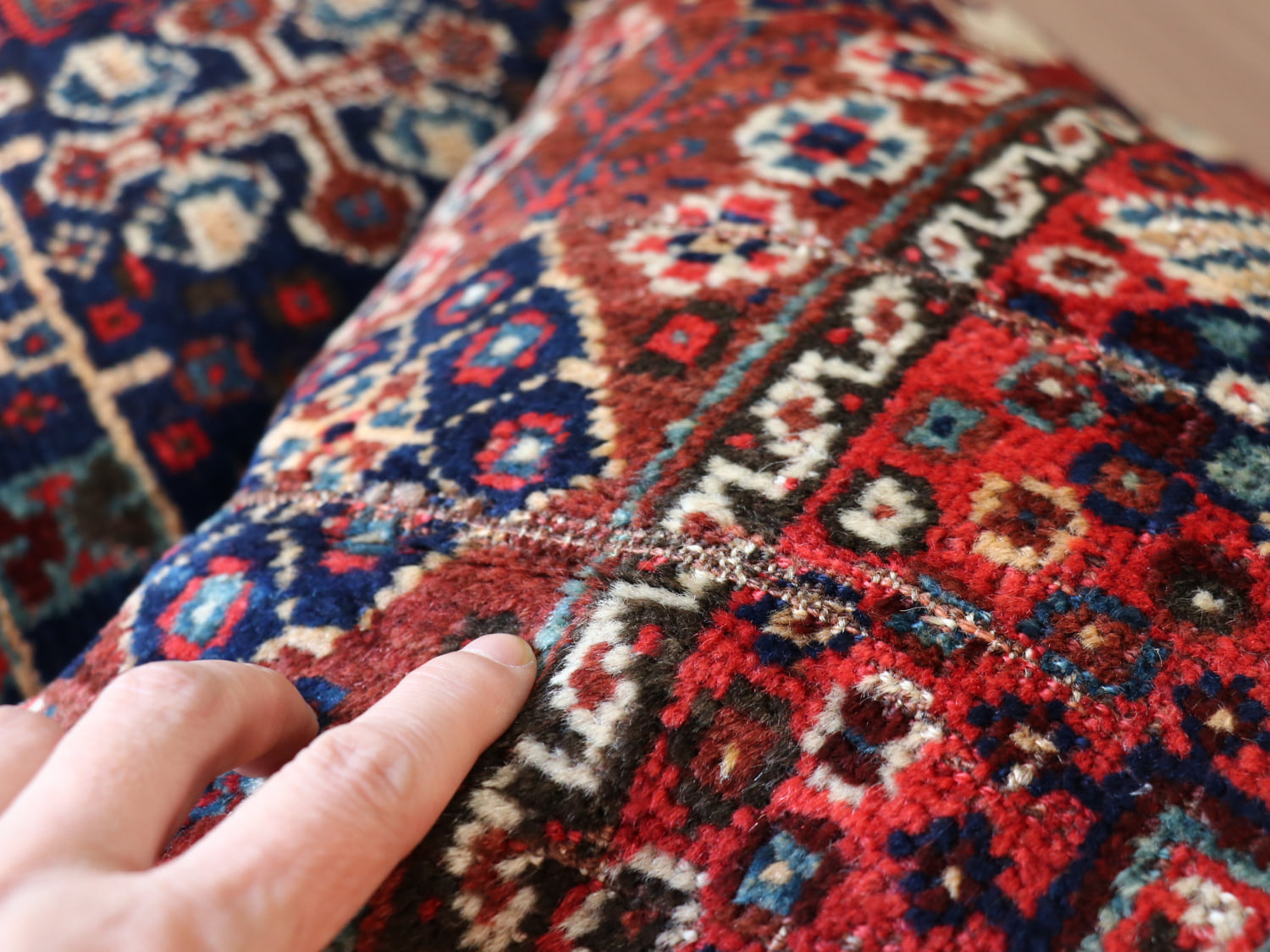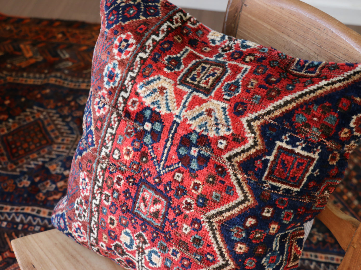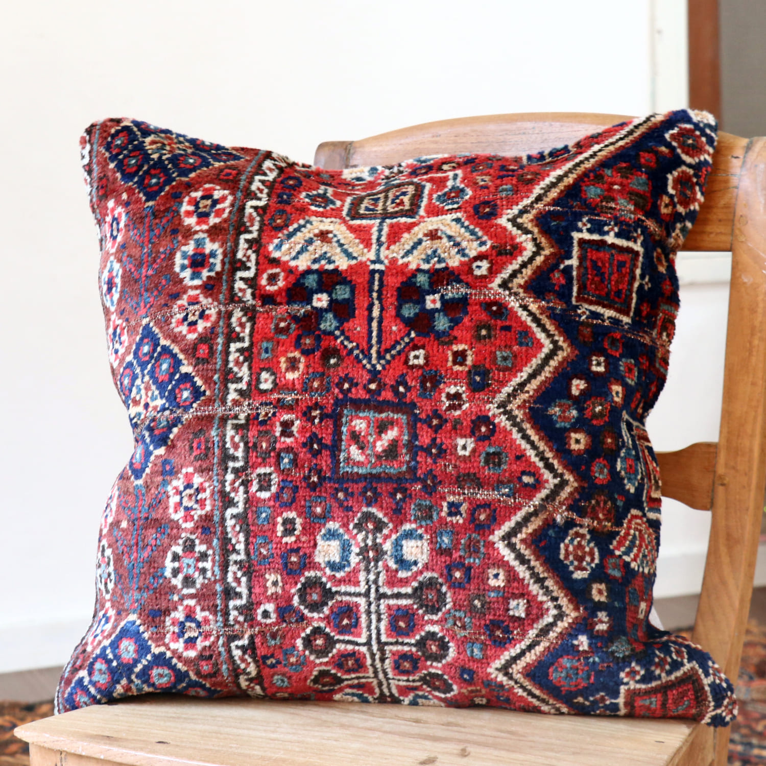 | 20世紀初頭に織られたアンティークラグからカットされたパイル織り絨毯のクッションカバーです。イラン南部に暮らすカシュカイ族のもので、天然染料による美しい色が100年経った現在でも、きれいに残っています。 |
