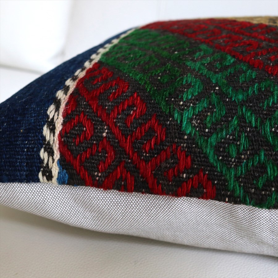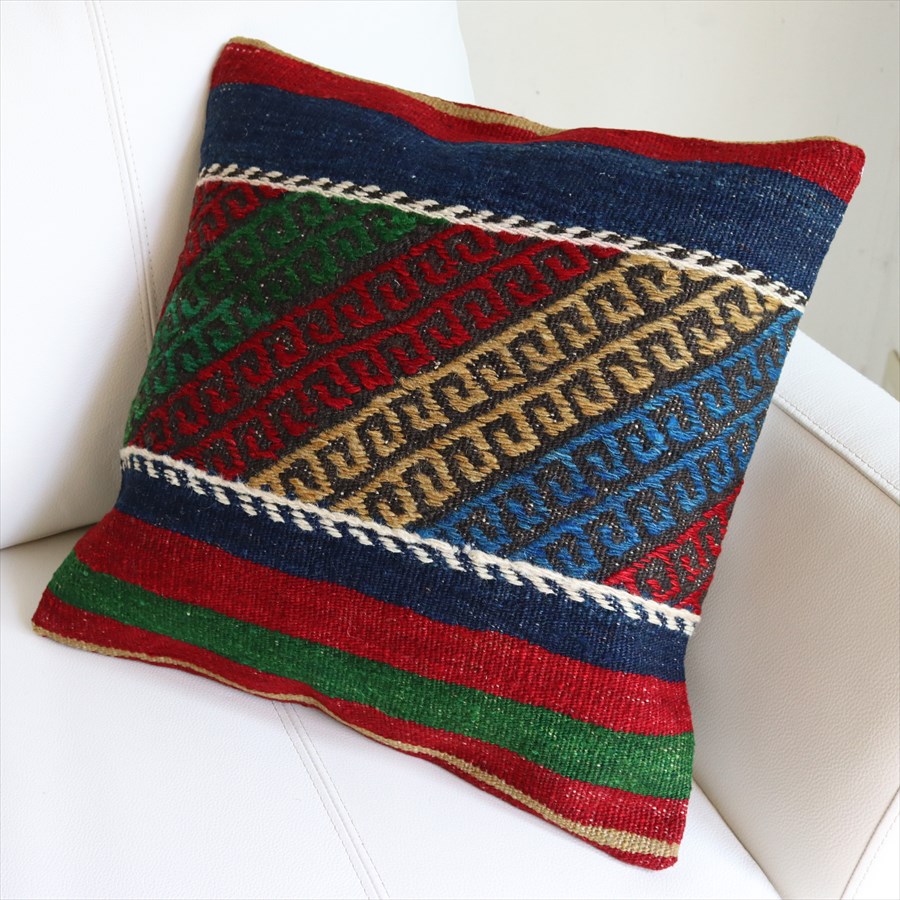 4. オールドキリムクッションカバー40cm角 Kilim Cushion シンプルボーダー・レッド&ブルー&グリーン
