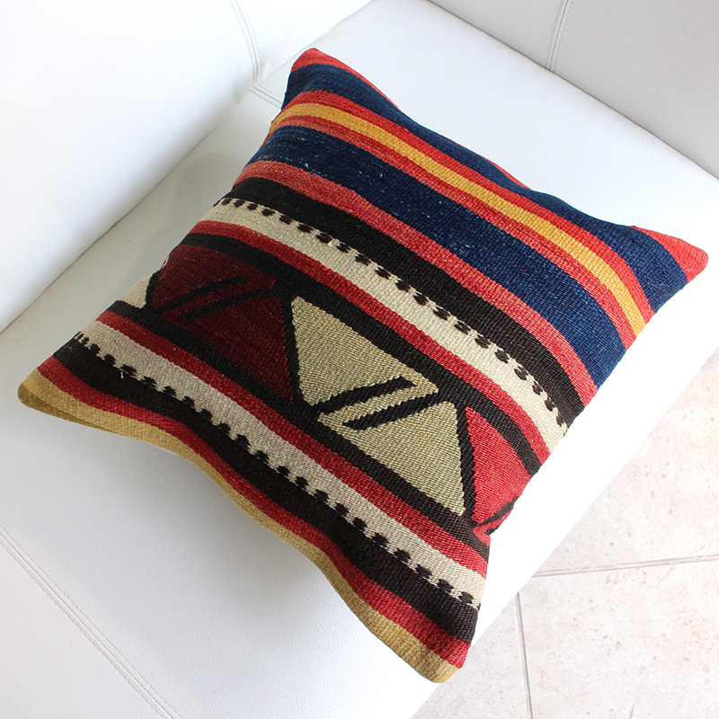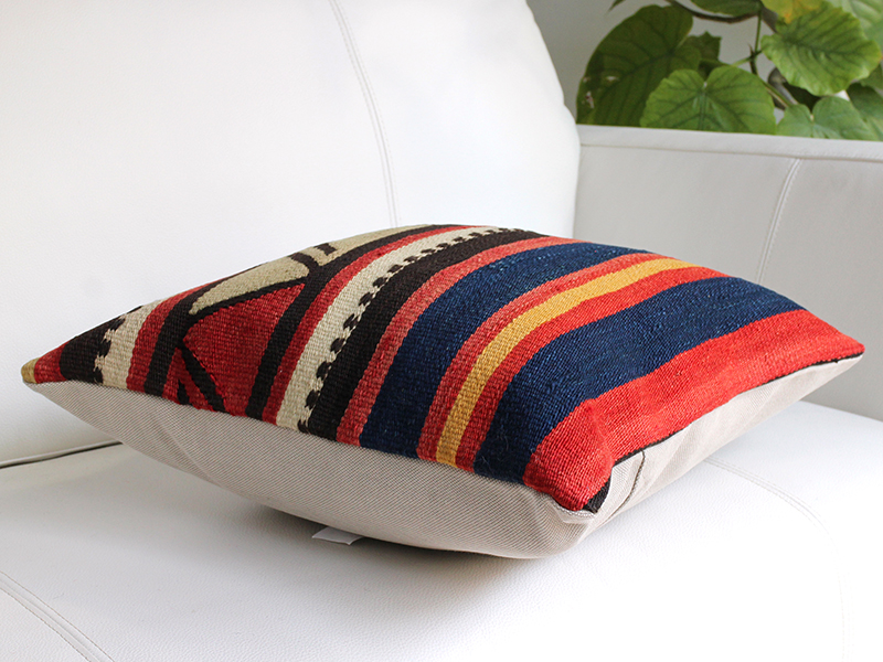 オールドキリムクッションカバー40cmサイズ/Old Kilim Cushion ブルー・レッド・イエローのボーダー