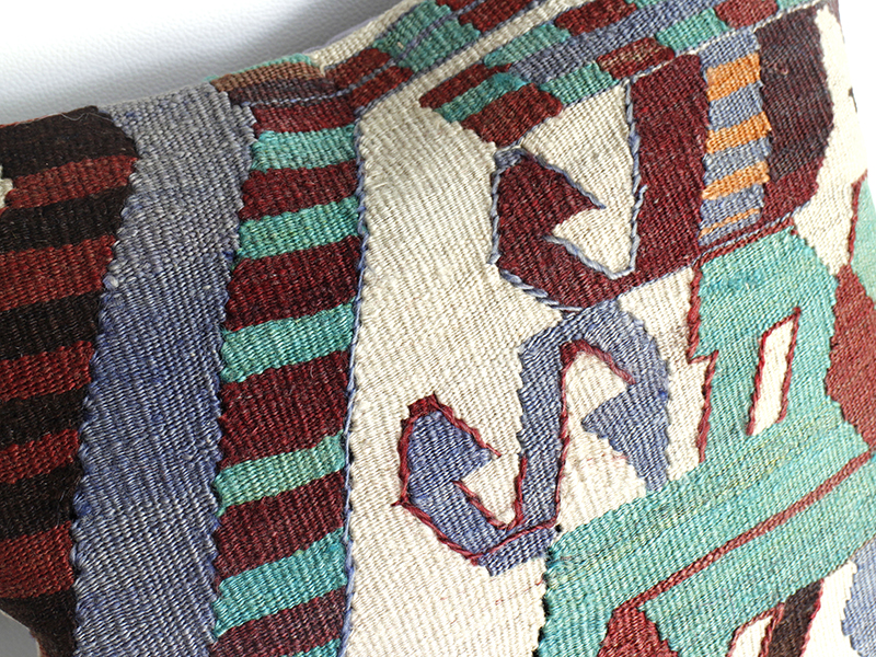 | 大型のチフカナットキリム(左右別々に織って中央ではぎ合わせる)で、モチーフがたくさん入った賑やかなデザインのキリムからのカット。ナチュラルアイボリーの地にグリーンとブルー(元は紫色)、黒みがかった赤色が使われています。 |