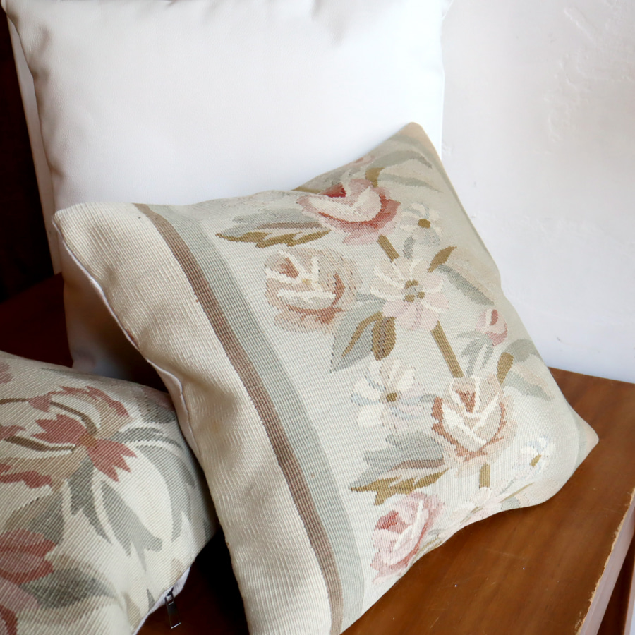 | クリーム色のベースに淡いピンクやグリーンで一面に花模様が織り込まれたルーマニア地方のキリムです。もともと大きなサイズのキリムだったようで、連続していたデザインのクッションが20枚ほどはいってきました。ところどころ、色のニジミ、うすいシミなどがありますことをご了承ください。 |