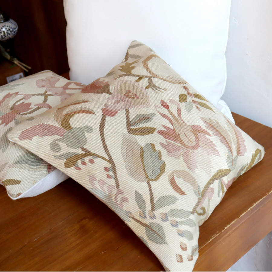 | クリーム色のベースに淡いピンクやグリーンで一面に花模様が織り込まれたルーマニア地方のキリムです。もともと大きなサイズのキリムだったようで、連続していたデザインのクッションが20枚ほどはいってきました。ところどころ、色のニジミ、うすいシミなどがありますことをご了承ください。 |