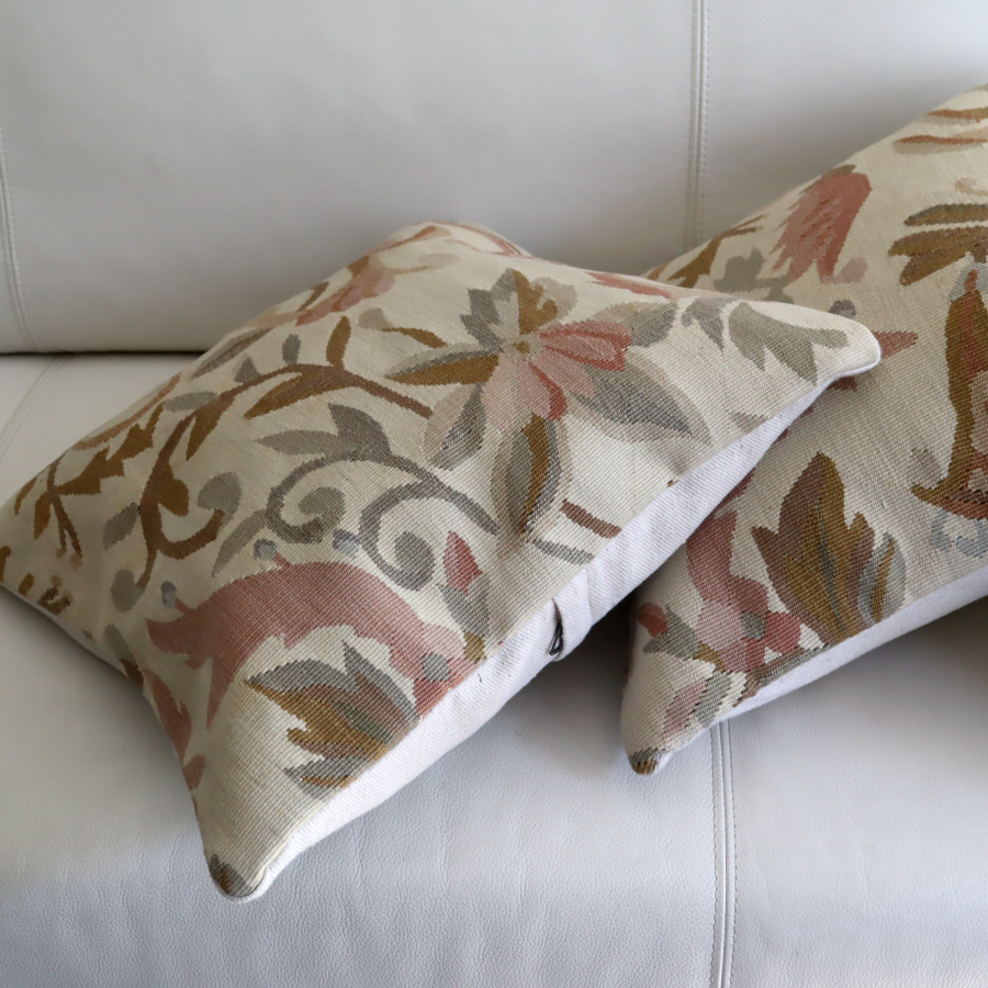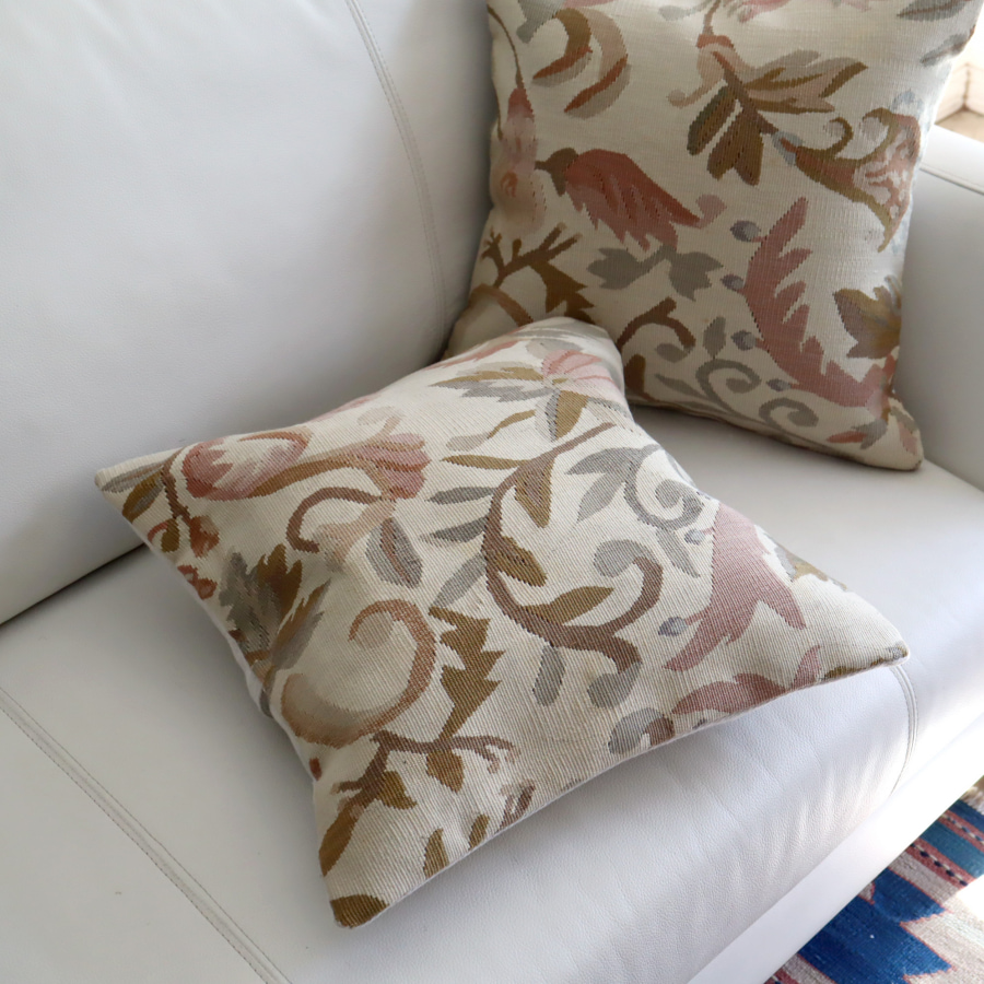 クリーム色のベースに淡いピンクやグリーンで一面に花模様が織り込まれたルーマニア地方のキリムです。もともと大きなサイズのキリムだったようで、連続していたデザインのクッションが20枚ほどはいってきました。ところどころ、色のニジミ、うすいシミなどがありますことをご了承ください。