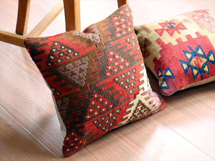 | 【オールドキリム】古い時代(主に1960-1980年代)に、一般の家庭で織られたウールの手織りキリムを表面に使ったクッションカバーです。擦り切れた個所や、日焼け、修理のあとなどがある場合がございますことをご了承ください。クッションはトルコで縫製されていて、縫製前にはきれいにクリーニングしてあります。 クッションカバーの裏面は無地のコットン、色はそれぞれ異なりますので表記してあります。 【お手入れについて】オールドキリムの染料が色落ちする場合がありますのでほかのものと一緒に洗わないようご注意ください。液体洗剤で押し洗いしたあと、よくすすいで、フラットにして乾かしてください。 |