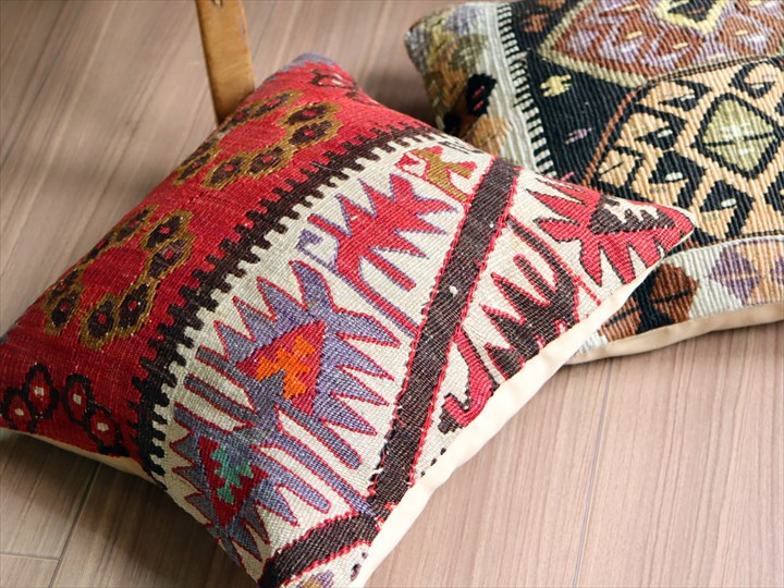 | 【オールドキリム】古い時代(主に1960-1980年代)に、一般の家庭で織られたウールの手織りキリムを表面に使ったクッションカバーです。擦り切れた個所や、日焼け、修理のあとなどがある場合がございますことをご了承ください。クッションはトルコで縫製されていて、縫製前にはきれいにクリーニングしてあります。 クッションカバーの裏面は無地のコットン、色はそれぞれ異なりますので表記してあります。 【お手入れについて】オールドキリムの染料が色落ちする場合がありますのでほかのものと一緒に洗わないようご注意ください。液体洗剤で押し洗いしたあと、よくすすいで、フラットにして乾かしてください。 |