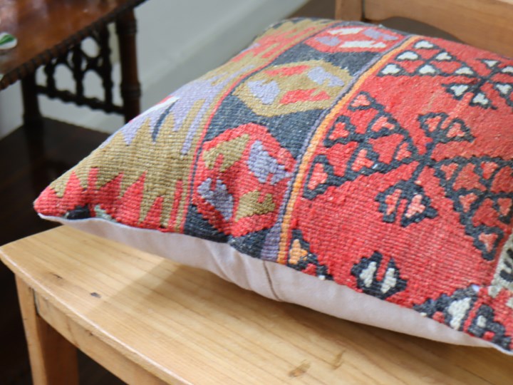 | 【オールドキリム】古い時代(主に1960-1980年代)に、一般の家庭で織られたウールの手織りキリムを表面に使ったクッションカバーです。擦り切れた個所や、日焼け、修理のあとなどがある場合がございますことをご了承ください。クッションはトルコで縫製されていて、縫製前にはきれいにクリーニングしてあります。 クッションカバーの裏面は無地のコットン、色はそれぞれ異なりますので表記してあります。 【お手入れについて】オールドキリムの染料が色落ちする場合がありますのでほかのものと一緒に洗わないようご注意ください。液体洗剤で押し洗いしたあと、よくすすいで、フラットにして乾かしてください。 |