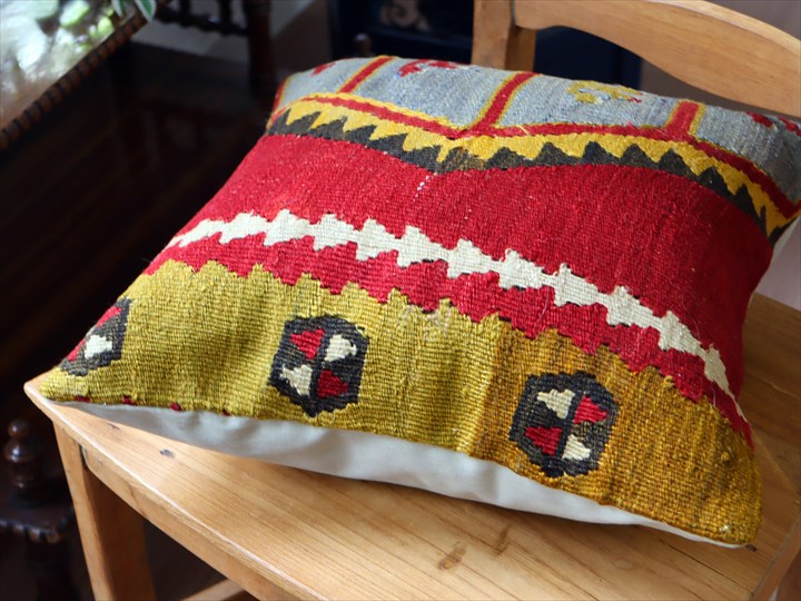 | 【オールドキリム】古い時代(主に1960-1980年代)に、一般の家庭で織られたウールの手織りキリムを表面に使ったクッションカバーです。擦り切れた個所や、日焼け、修理のあとなどがある場合がございますことをご了承ください。クッションはトルコで縫製されていて、縫製前にはきれいにクリーニングしてあります。 クッションカバーの裏面は無地のコットン、色はそれぞれ異なりますので表記してあります。 【お手入れについて】オールドキリムの染料が色落ちする場合がありますのでほかのものと一緒に洗わないようご注意ください。液体洗剤で押し洗いしたあと、よくすすいで、フラットにして乾かしてください。 |