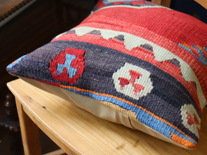 | 【オールドキリム】古い時代(主に1960-1980年代)に、一般の家庭で織られたウールの手織りキリムを表面に使ったクッションカバーです。擦り切れた個所や、日焼け、修理のあとなどがある場合がございますことをご了承ください。クッションはトルコで縫製されていて、縫製前にはきれいにクリーニングしてあります。 クッションカバーの裏面は無地のコットン、色はそれぞれ異なりますので表記してあります。 【お手入れについて】オールドキリムの染料が色落ちする場合がありますのでほかのものと一緒に洗わないようご注意ください。液体洗剤で押し洗いしたあと、よくすすいで、フラットにして乾かしてください。 |