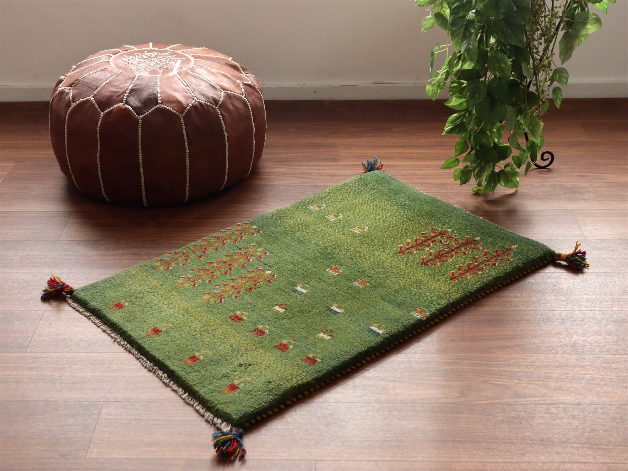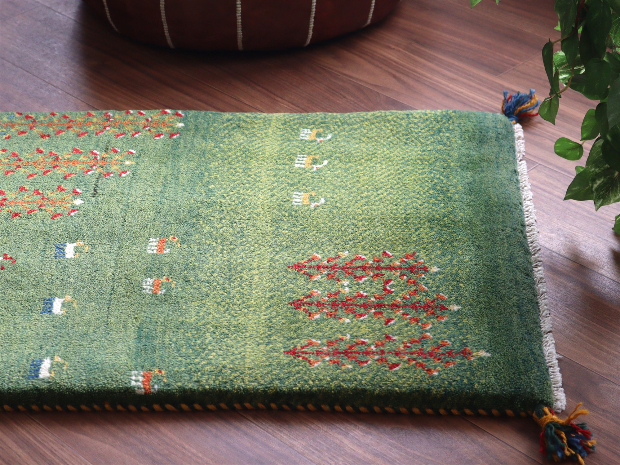 ギャッベ イラン産手織りラグ 93x60cm 生命の樹と動物 グリーン