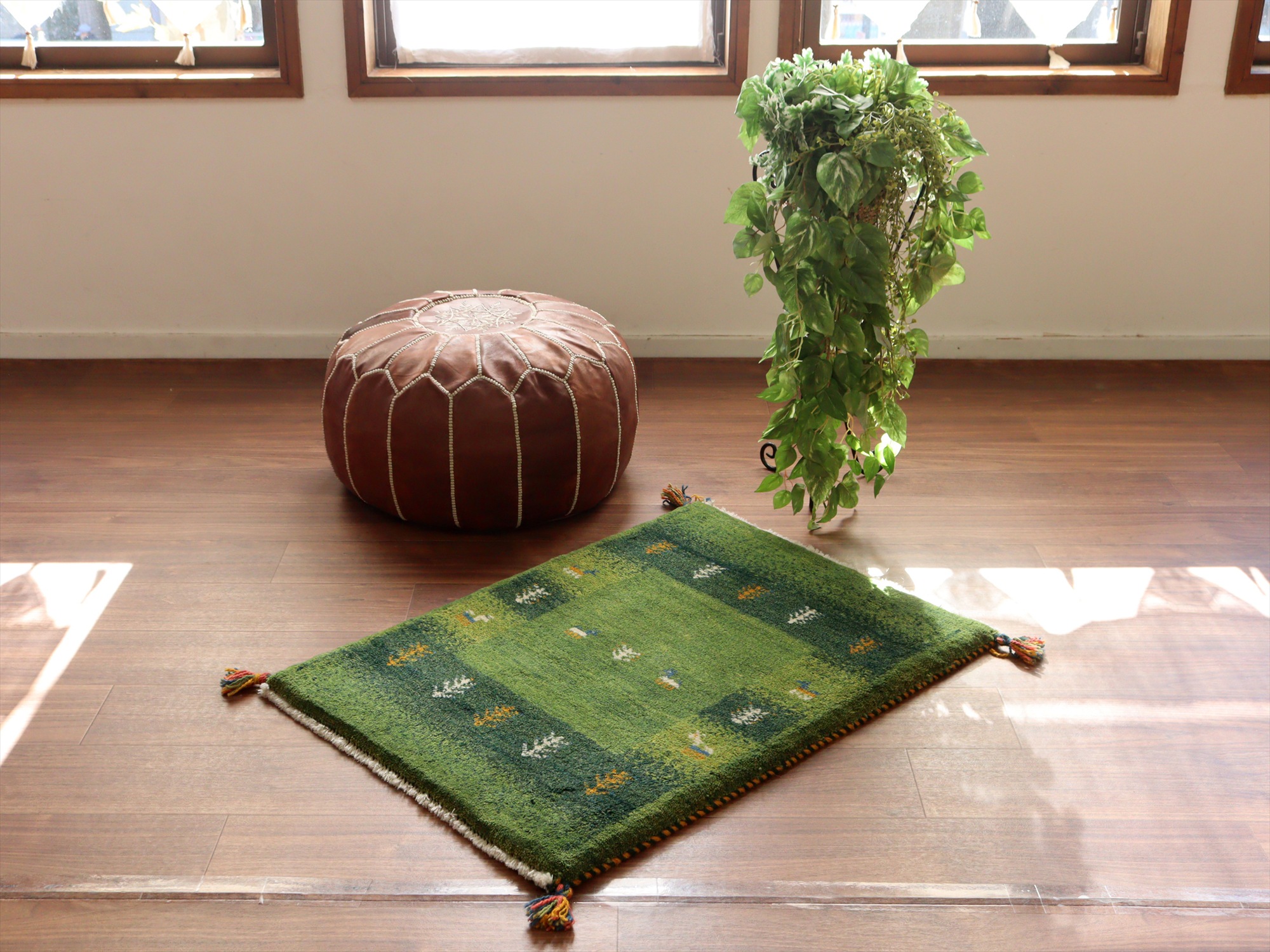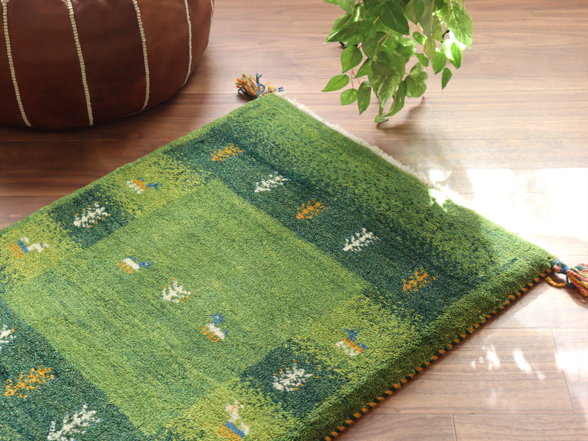 ギャッベ イラン産手織りラグ 88x63cm グリーン 動物と植物