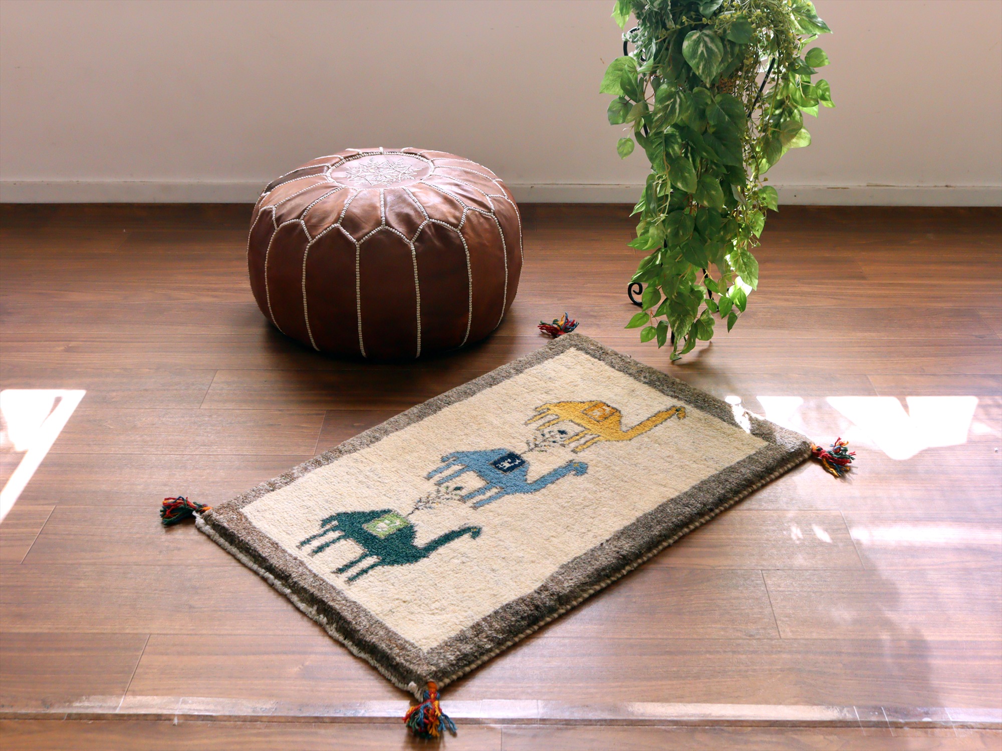 ギャッベ イラン産手織りラグ 88x55cm ラクダと植物 アイボリー