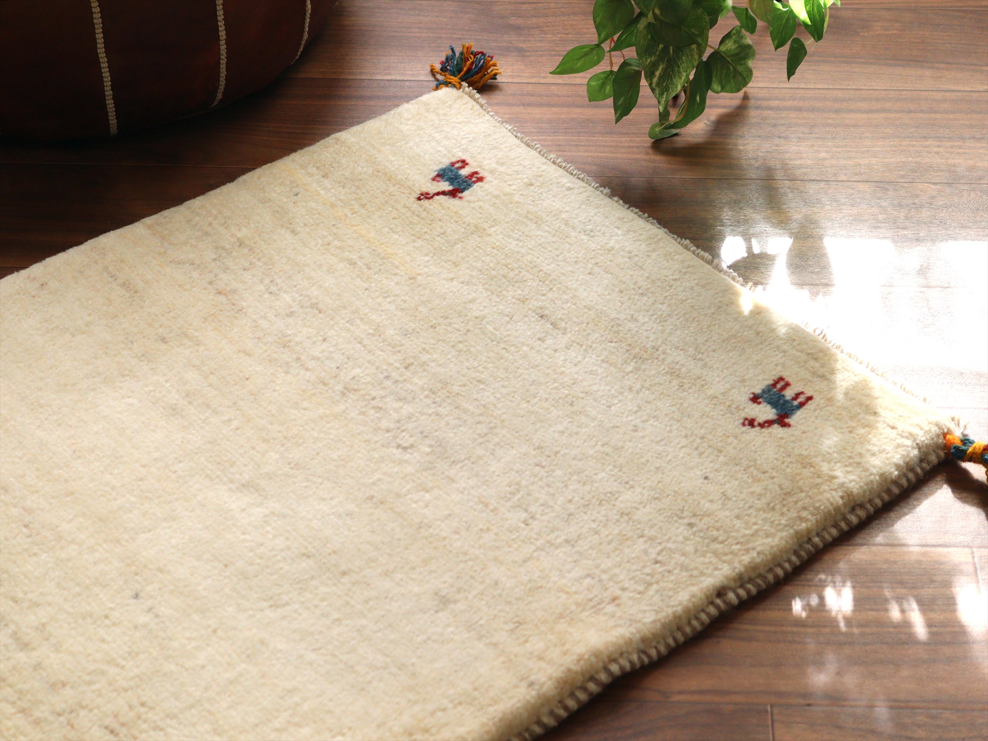 ギャッベ イラン産手織りラグ 88x66cm シンプルモチーフ アイボリー