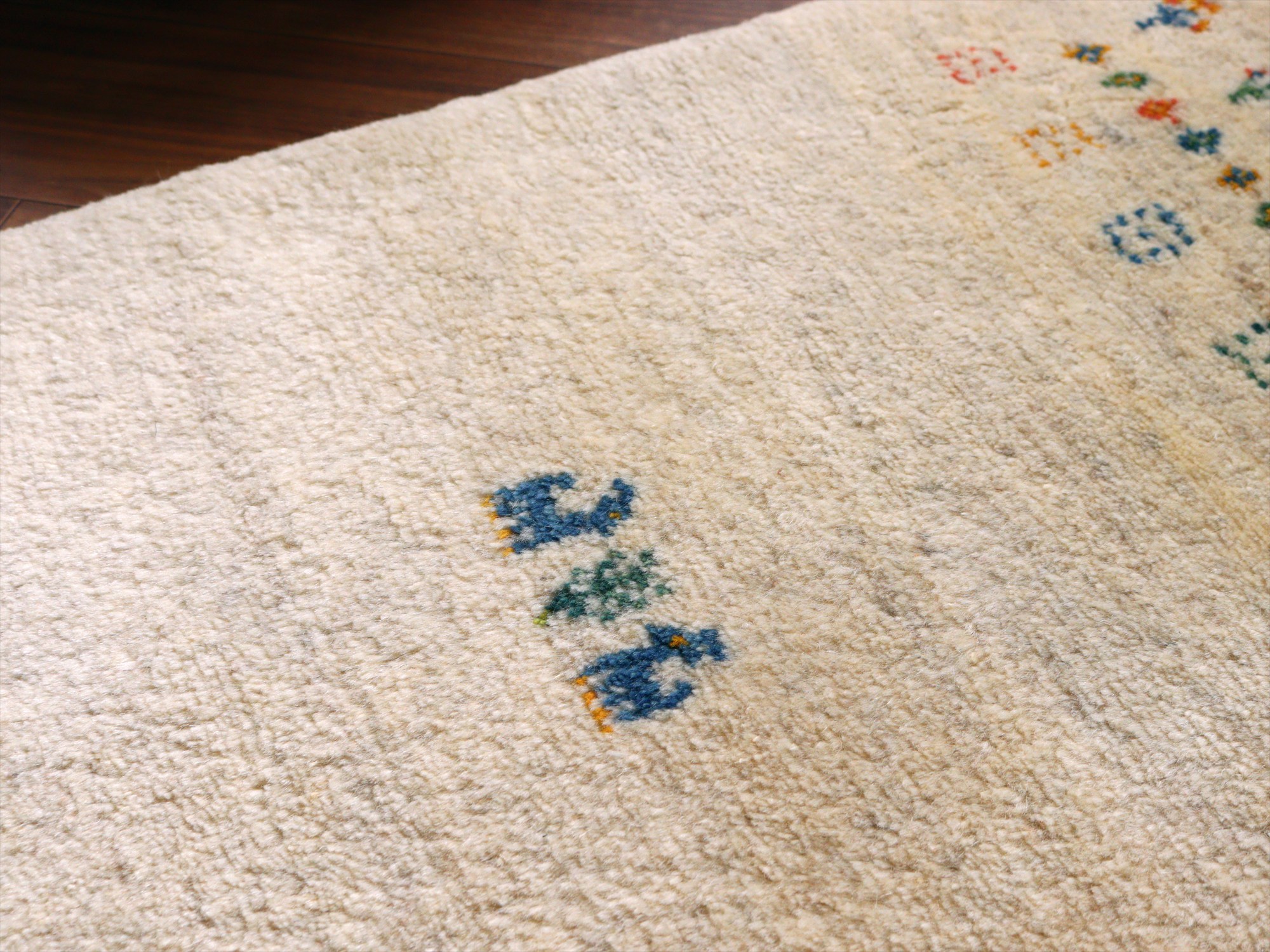 | 染めていない羊毛ベースに、羊や植物、小花などが織られたデザイン。黄色や赤など明るい色も取り入れられていて、かわいらしい雰囲気です。 |