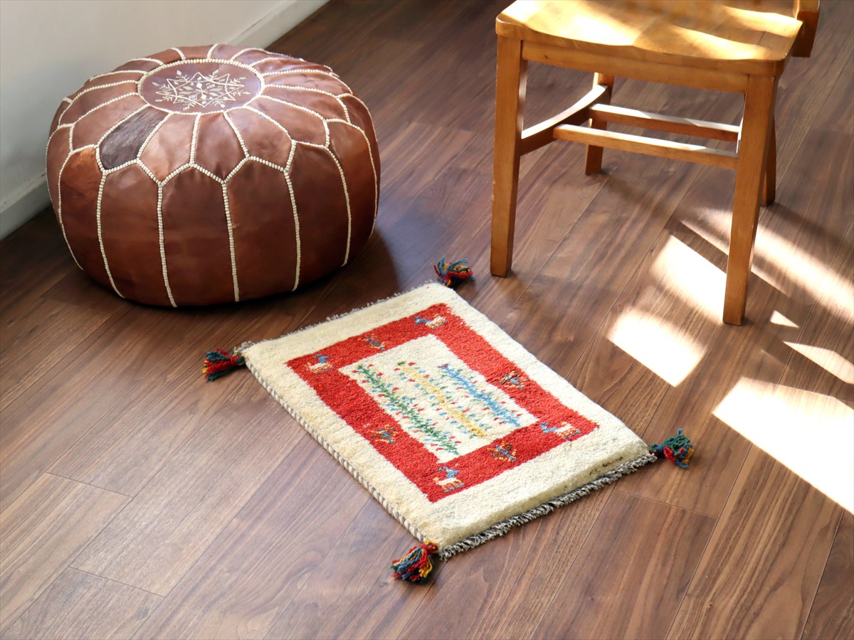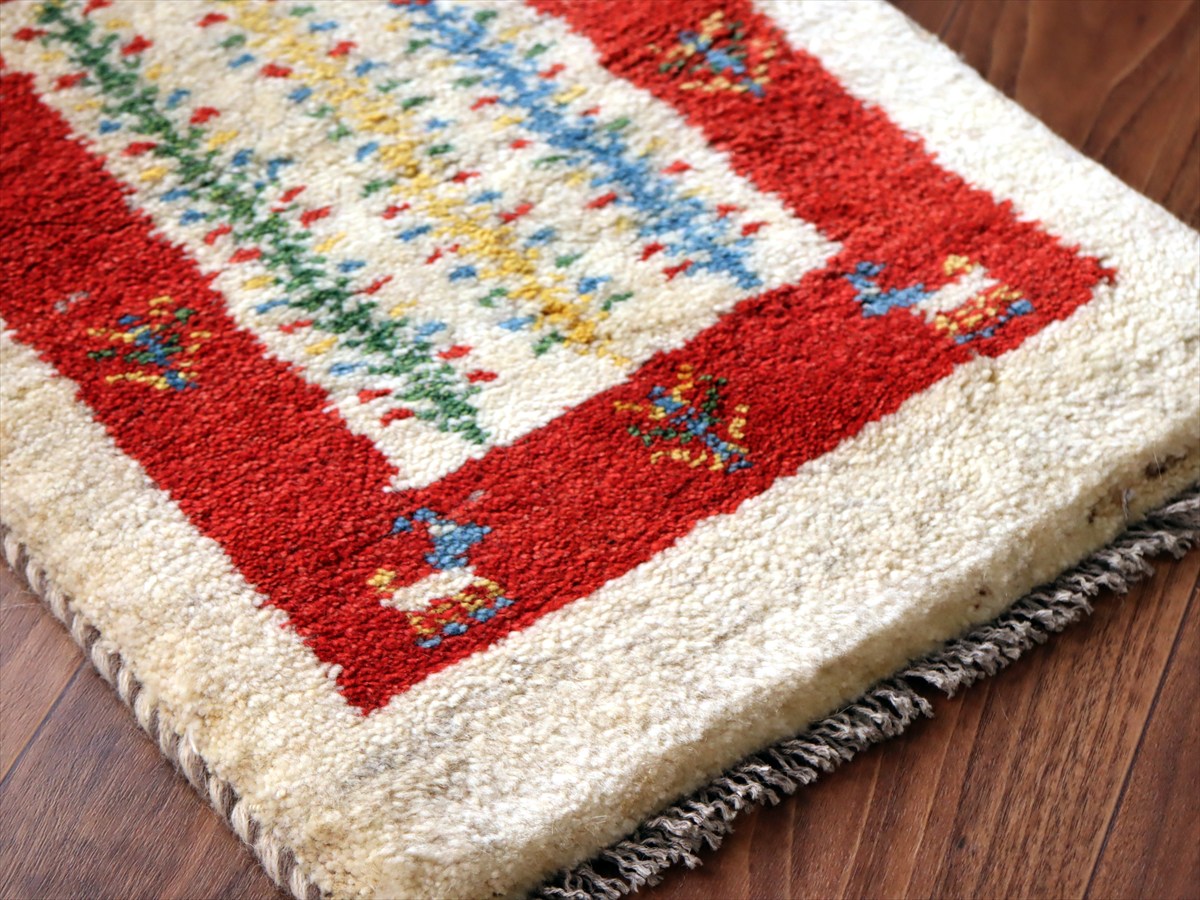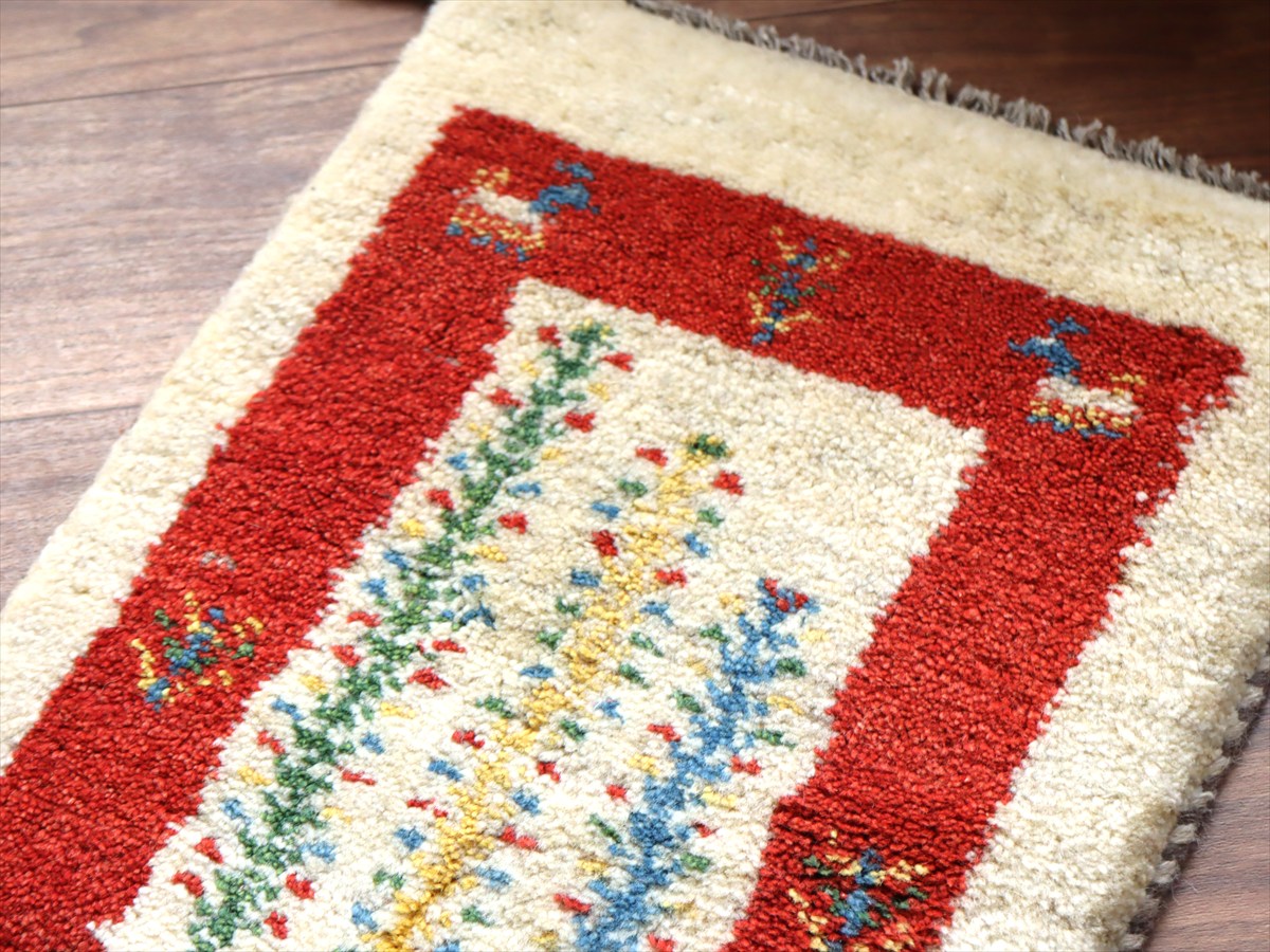 ギャッベ ミニギャベ イラン産 56×38cm ナチュラルアイボリー&レッド 連なる生命の樹と動物