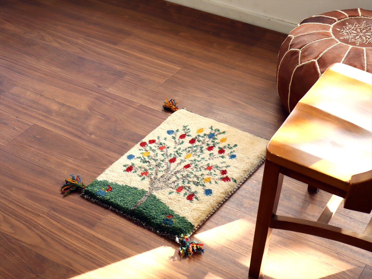 ギャッベ ミニギャベ イラン産 55×40cm ナチュラルアイボリー カラフルなザクロの樹