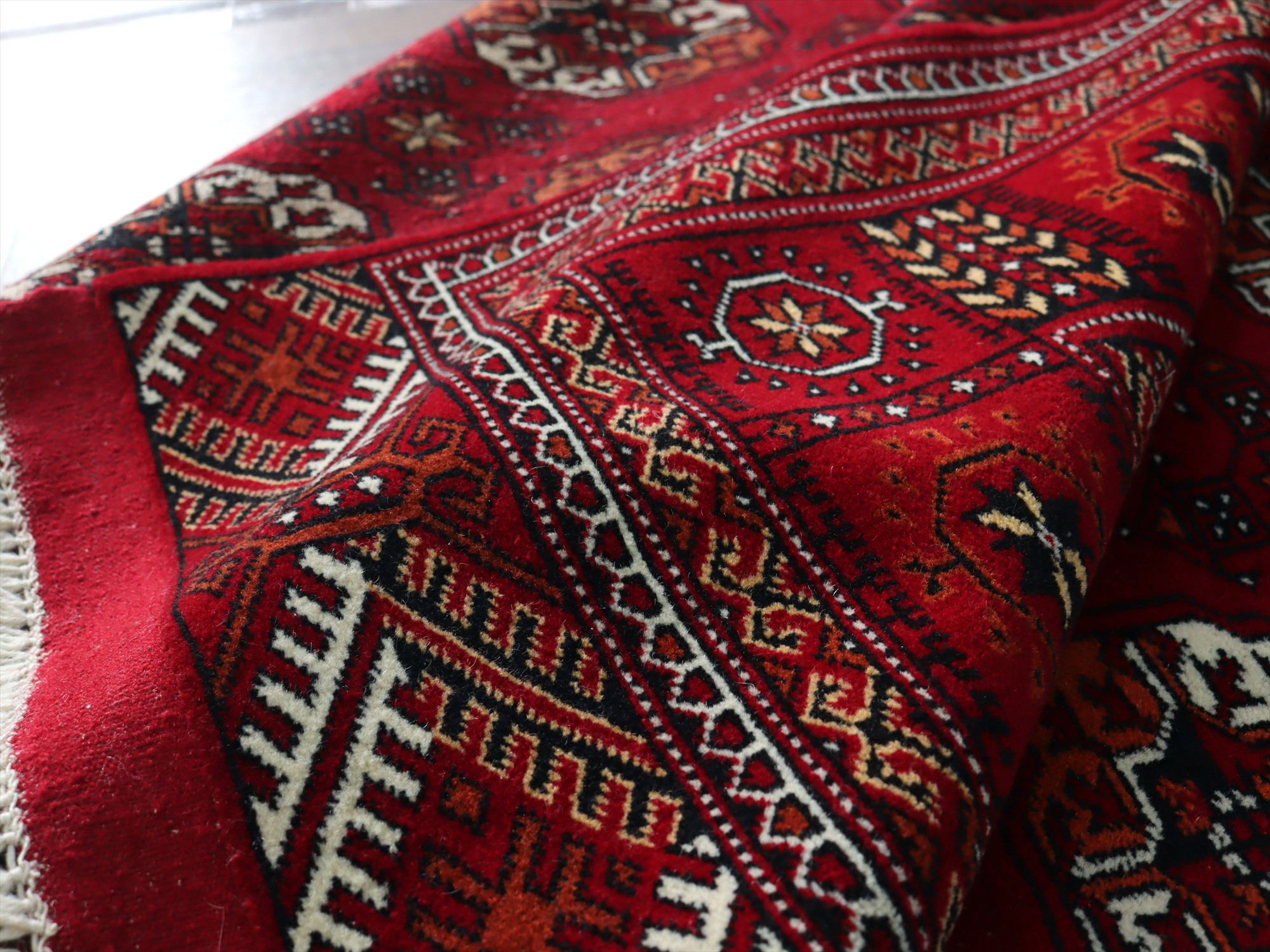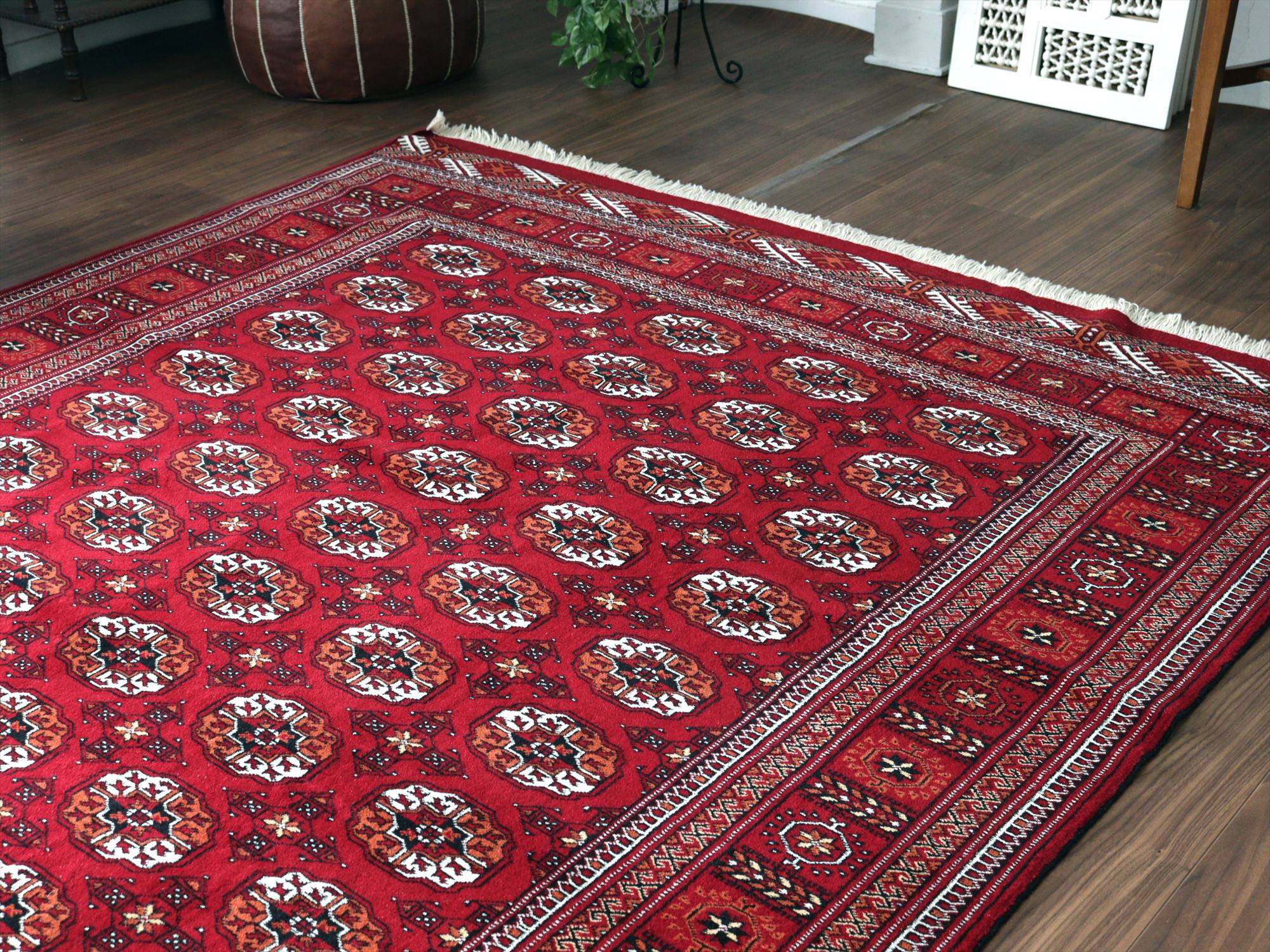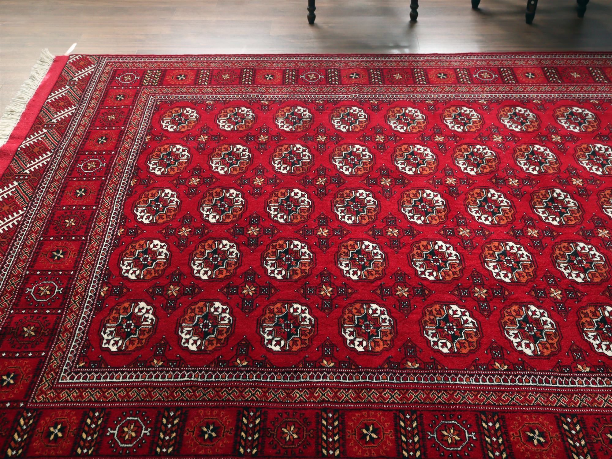| 中央アジア一帯に住むトルクメン族の絨毯。6平米という大きさは、日本のマーケットではなかなかお目にかかれない貴重なサイズです。幾何学模様が連続するデザインは使いやすく、探していた方はぜひお手に取っていただきたい1枚です。 |