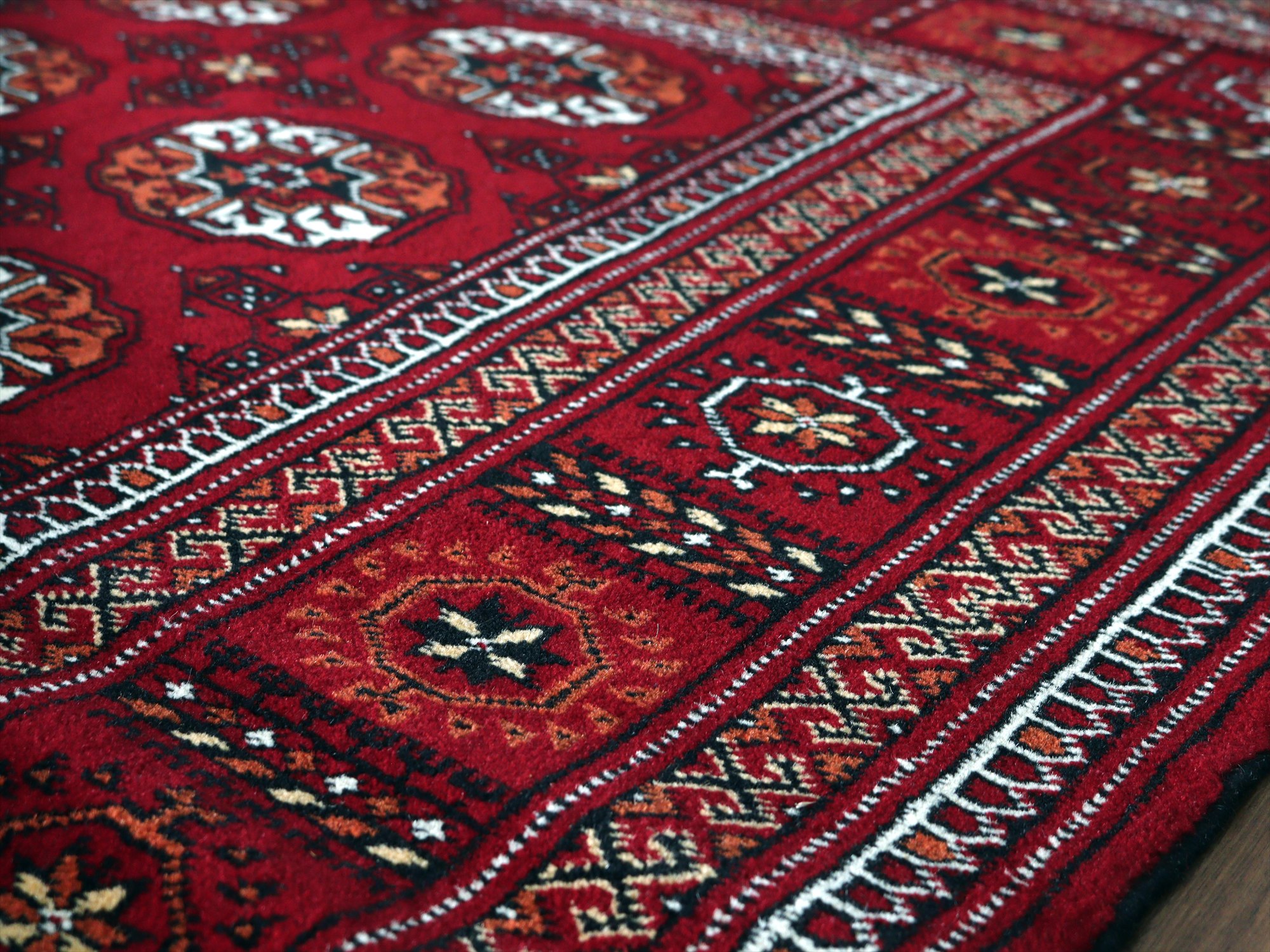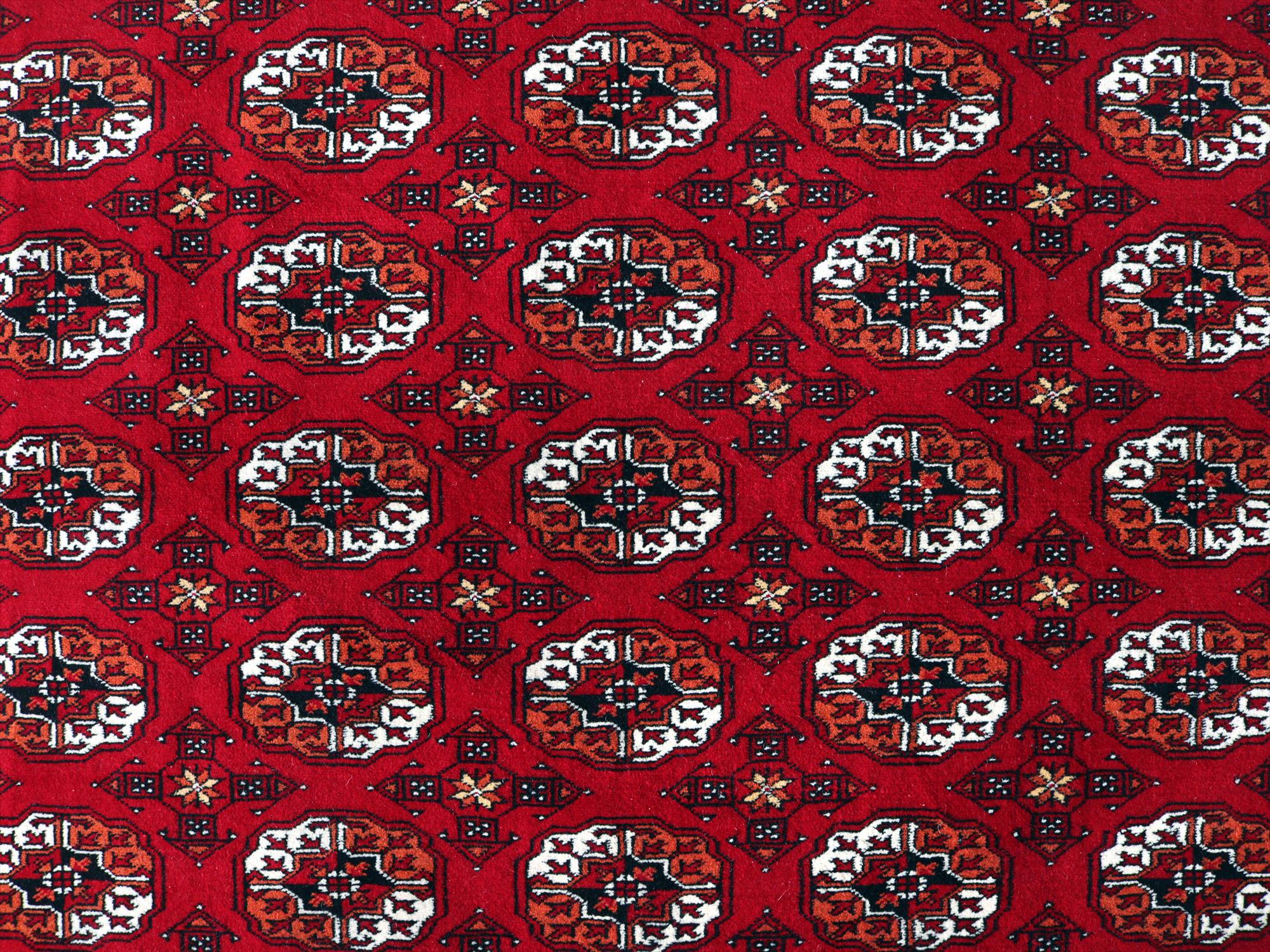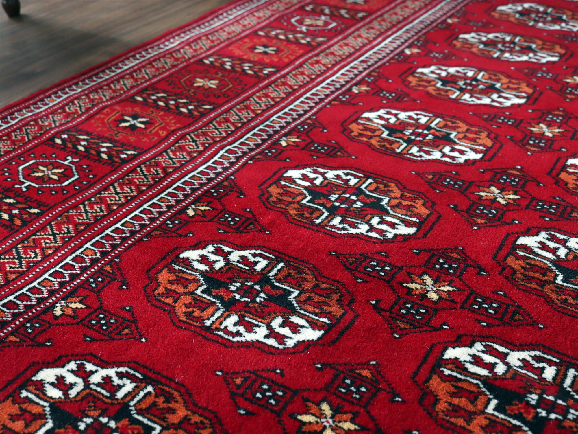 | 中央アジア一帯に住むトルクメン族の絨毯。6平米という大きさは、日本のマーケットではなかなかお目にかかれない貴重なサイズです。幾何学模様が連続するデザインは使いやすく、探していた方はぜひお手に取っていただきたい1枚です。 |