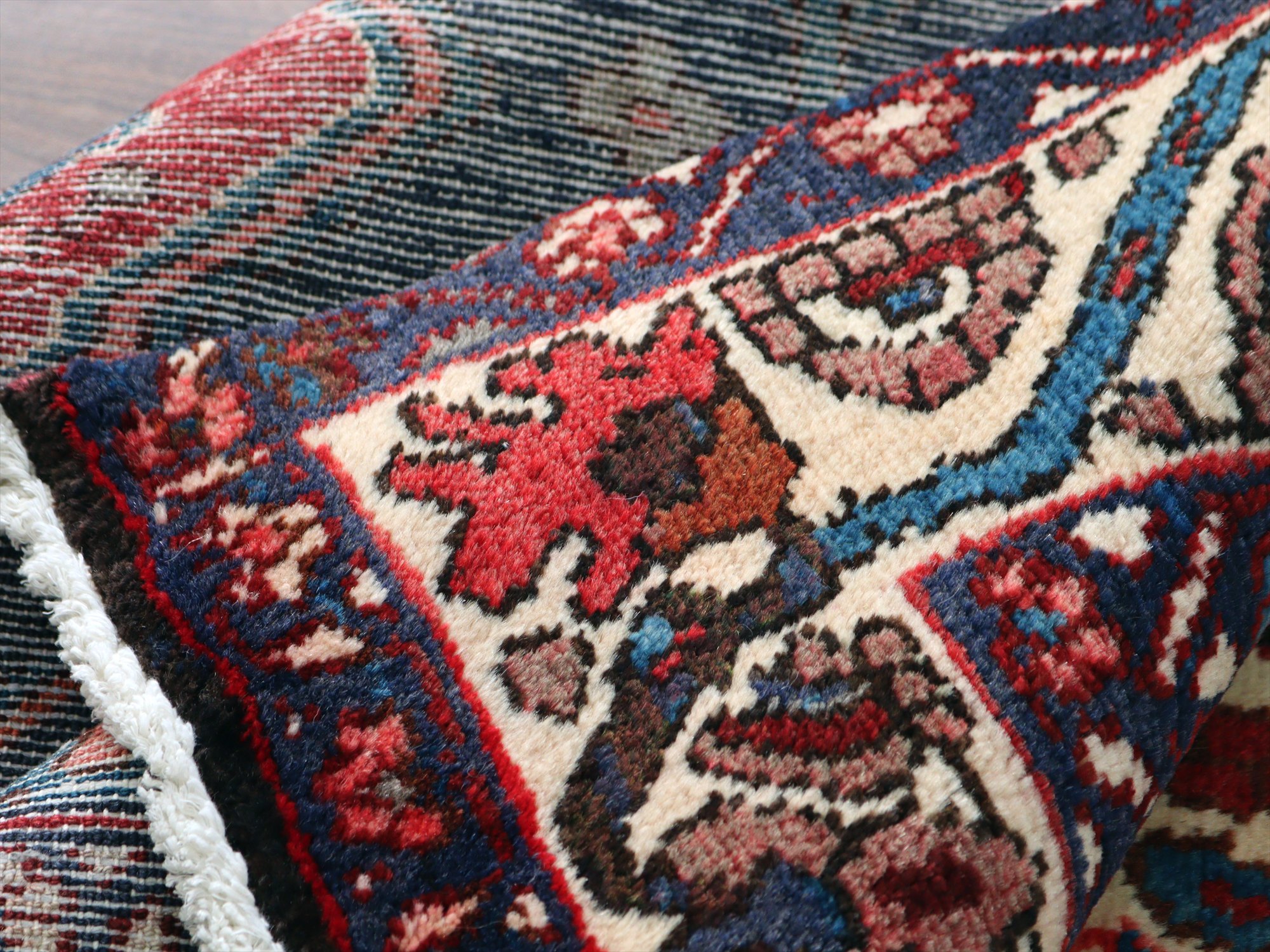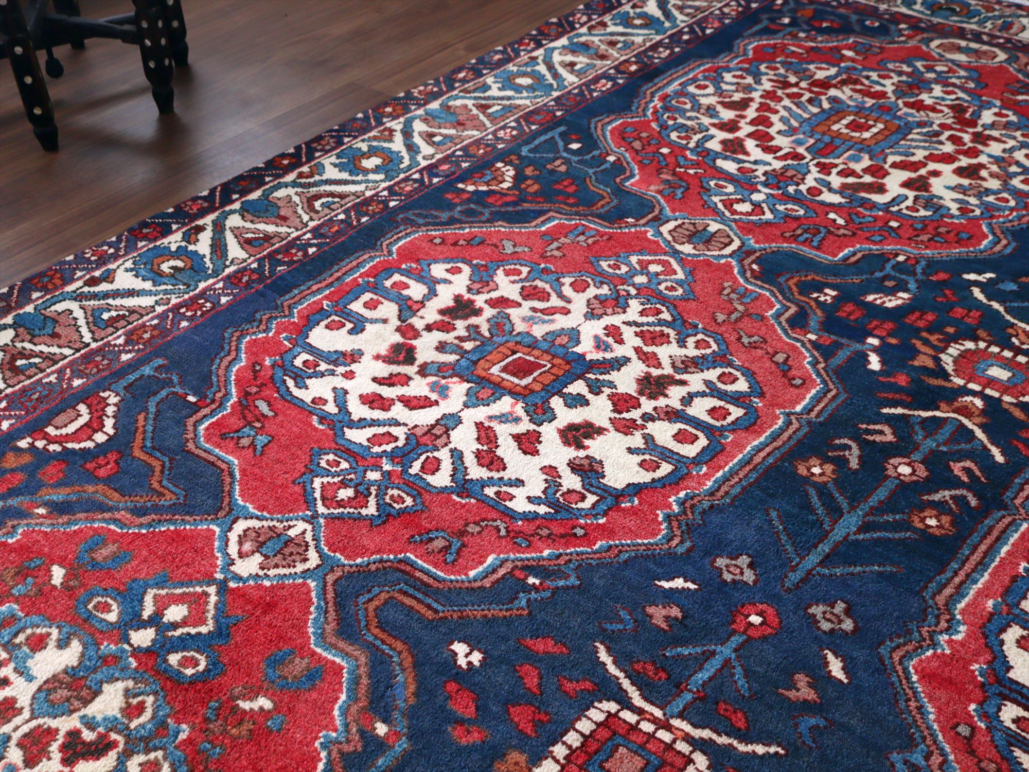 | 濃紺ベースに大柄の花形のメダリオンがおかれたデザイン。地の色が深いのでベージュがパキッと映えます。ボーダー部分にも、花が連なるように織られていて華やかな1枚です。 |