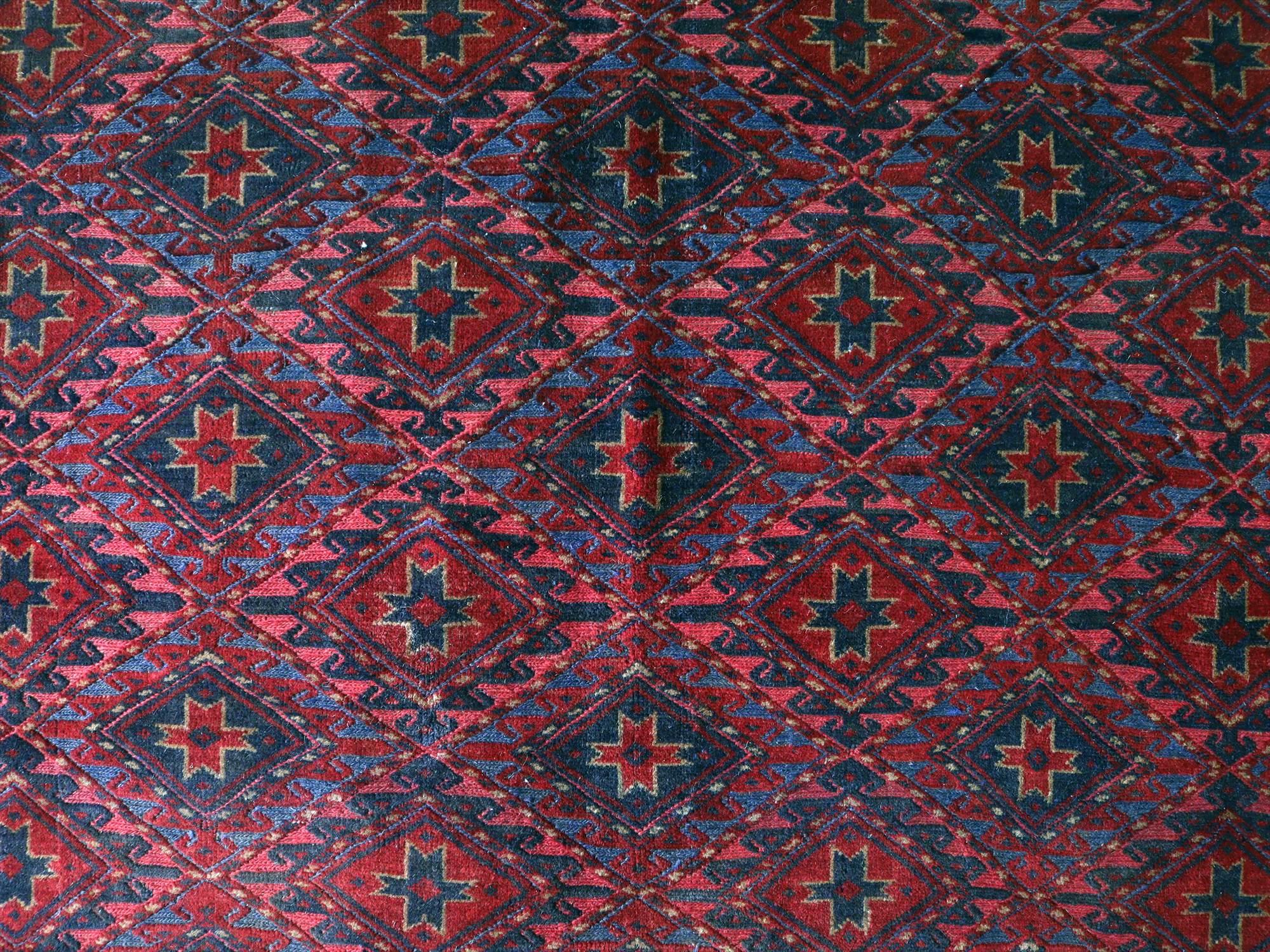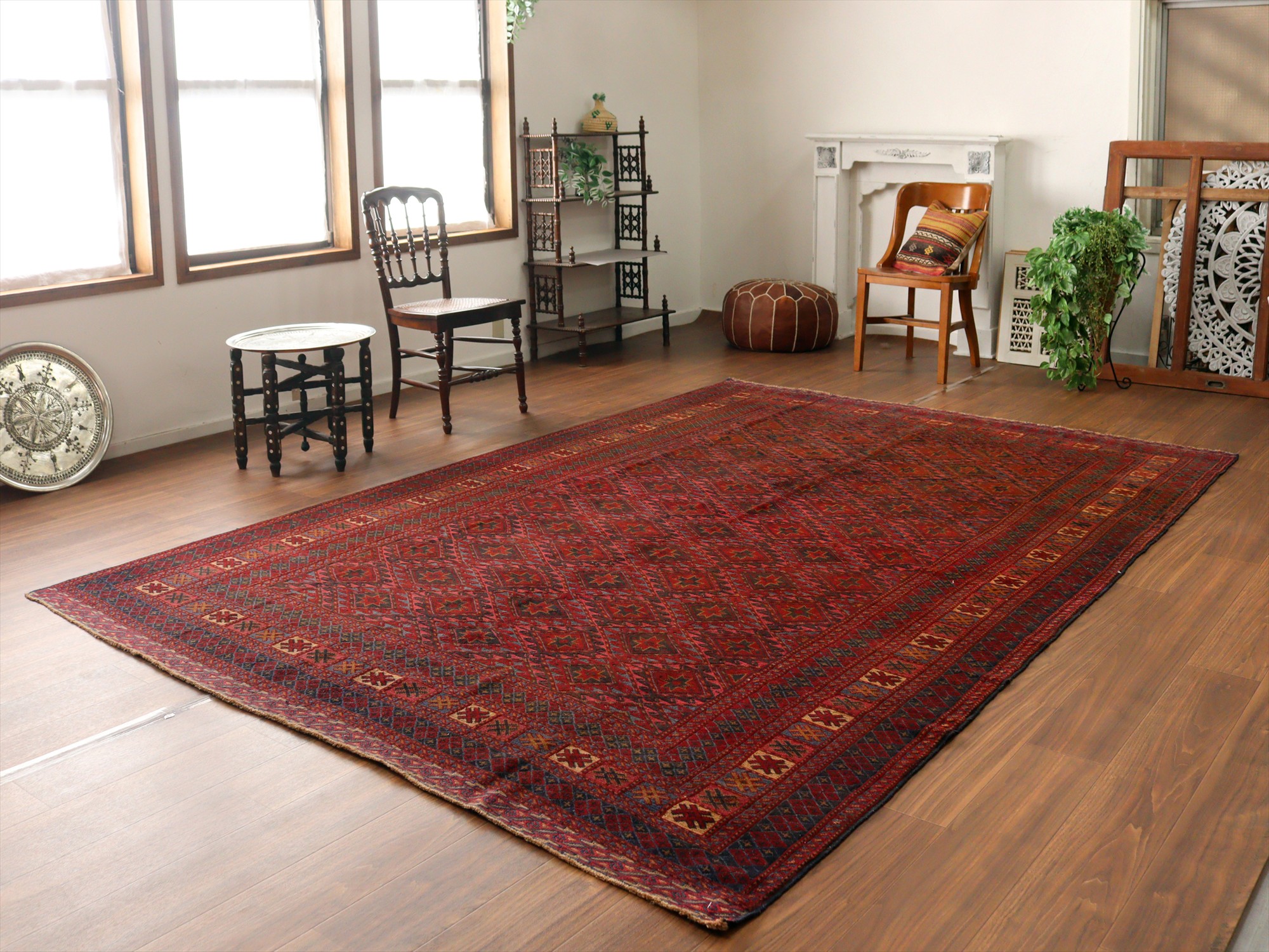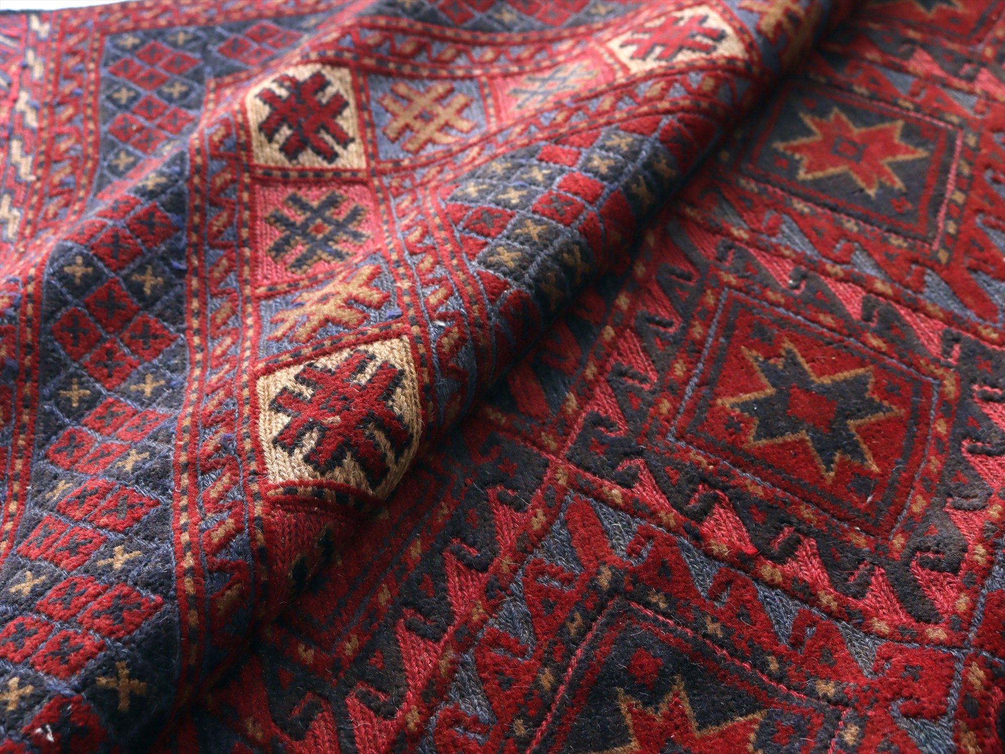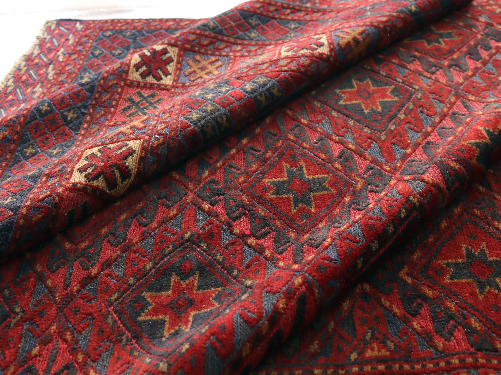 | アフガニスタン東部、イランと国境を接するエリアの緻密な織りのキリムです。細かい織り目のスマック織りをベースに、立体感のあるカーペット織りでモチーフをレリーフのように織り込んだ1枚。 |