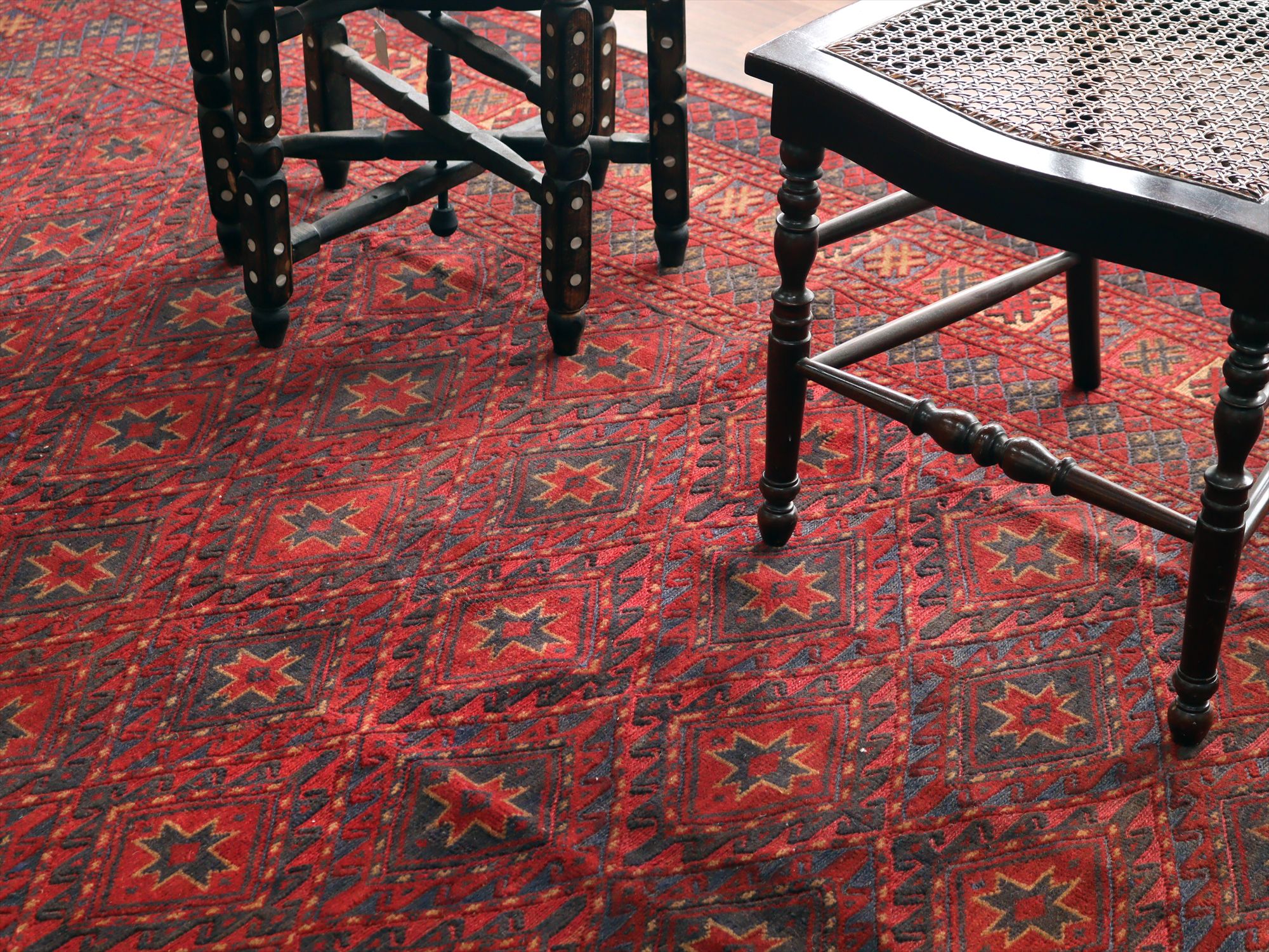 | ベース地はスマック織りでしっかりとした織り地です。モチーフ部分はパイル(毛足)のある織りで、表面には立体感があります。 |
